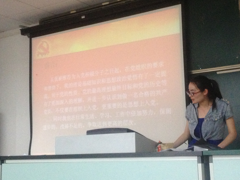 入党积极分子公开答辩分个人陈述和现场问答两个环节。16名入党积极分子首先从思想、学习、生活、群众关系和入党动机等方面进行了个人陈述;其次,针对与会人员提出的有关党员作用的发挥、保持党员先进性等实践层面的问题发表自己的看法。为了更好的展现自己,表述自己的入党动机,大部分入党积极分子秉着实事求是的原则做到了脱稿陈述,将党的理论与自己的学习生活实践相结合,甚至有的入党积极分子还制作了ppt ,以展现自己坚定的入党决心以及认真的做事态度。随后有表决权的党员、预备党员、部分入党积极分子根据入党积极分子们的答辩表现进行投票,唱票人员和公证人员对有效票进行了统计与监督。