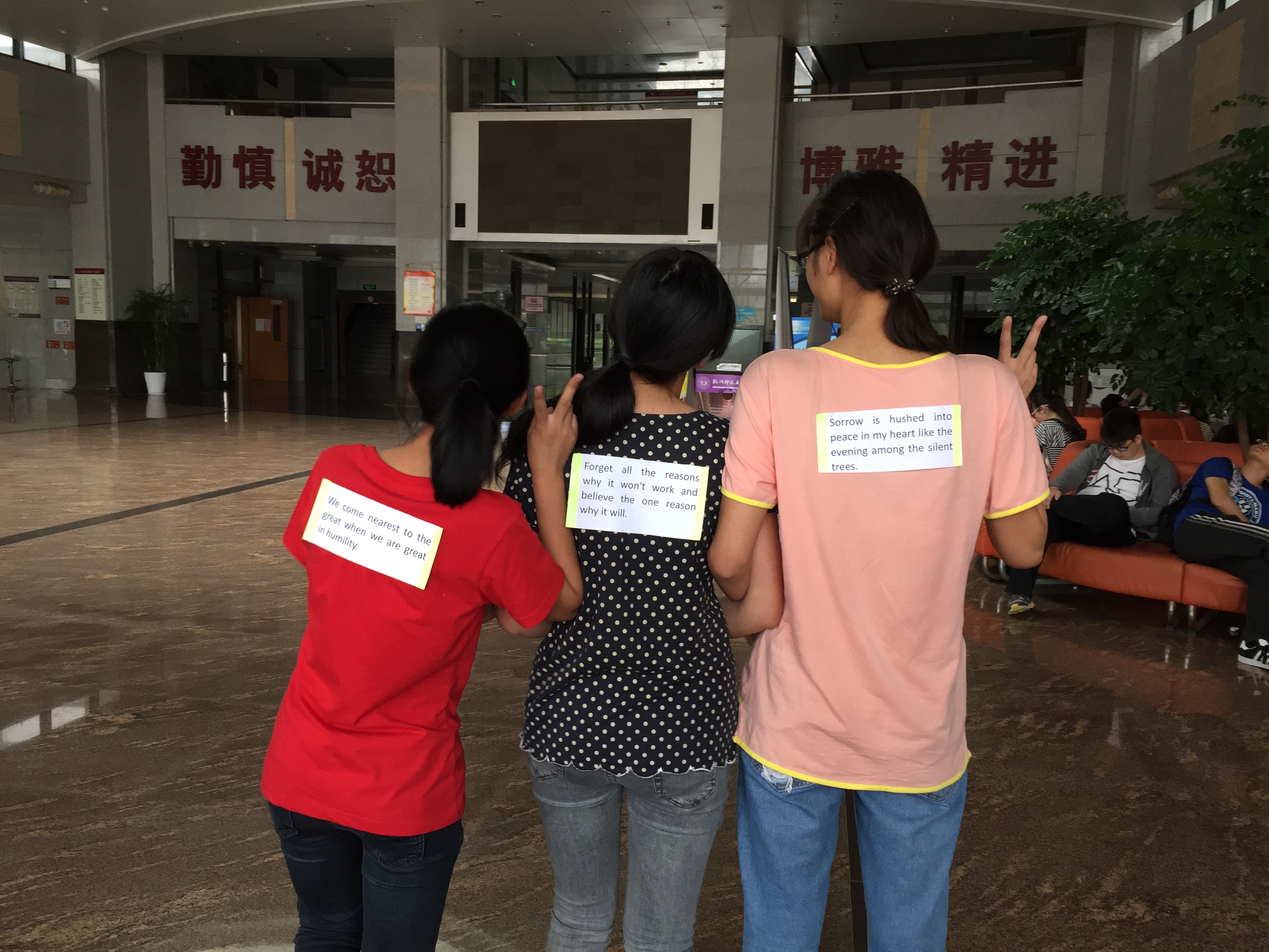 经过初赛和复赛的比拼,进军到决赛的同学们都有很强的英语实力,在比赛开始前虽有些紧张,但也无法压抑他们跃跃欲试的心情。比赛开始,同学们便在教学楼里积极的跑动起来了,认真的搜寻有中文翻译的纸条,每一个小角落都不放过。他们不仅要找到纸条,并且要准确贴在有相应英语句子的名牌上才能获得胜利,这也考验了他们的英语应变实力。比赛中同学们充分发挥团队合作精神,一些同学负责记住其他组成员背上的英文句子,一些同学负责找中文翻译的纸条,明确的分工让比赛愈加激烈。在紧张的比赛中,同学们也不忘欢笑。有些虽同学不幸被淘汰,但到最后也不忘给队友鼓劲,他们同样也是胜利者。随着纸条的全部找出比赛也接近尾声,最后叶冰倩、林青青、汤倩霞获得了本次大赛的冠军。