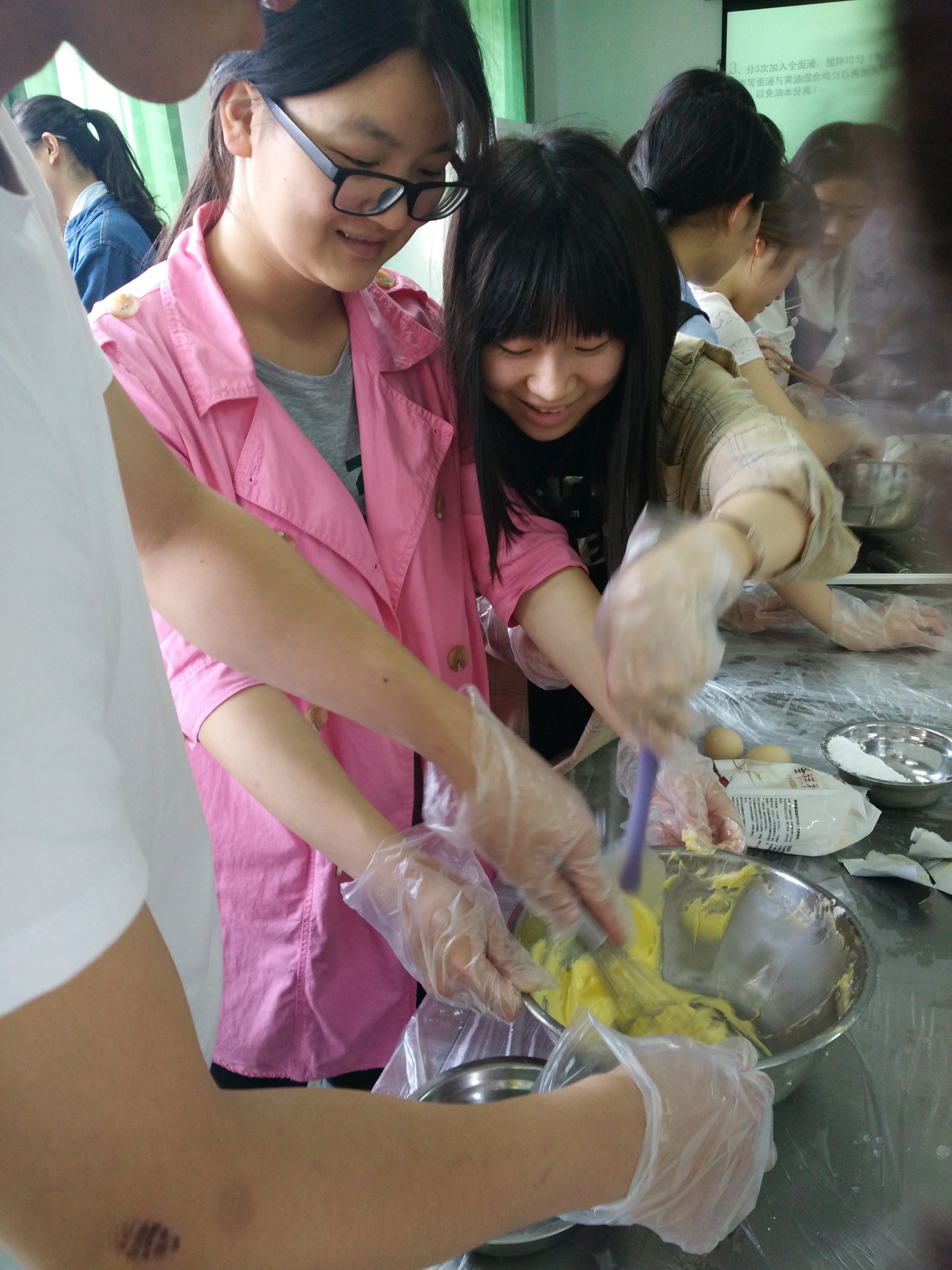 虽然同学们的参与热情高涨,但食品安全实验室容量有限,此次活动的参与者是随机选出的幸运儿。同学们都准时到达了实验室,也有感兴趣的同学前来观摩。参与同学在听过B.D.服务社干事的详细讲解后纷纷兴致盎然地开始制作属于自己的小饼干。融黄油、打鸡蛋、筛面粉……同学们忙得不亦乐乎,意愿在比赛中拔得头筹。