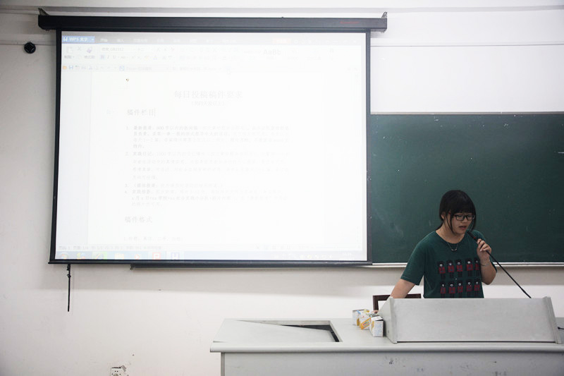 接着,由团委宣传部部长兼做爱自拍主任王柯诺向大家介绍关于实践活动过程中的稿件要求。每个参与实践活动的队伍都需要写关于此次活动的稿件,稿件主要分为四个部分。第一部分是“最新报道”,即 800字以内的新闻稿,由小分队宣传联络员负责,采取一事一报的形式报导今天的活动,视日程安排而定,每支队伍每天1—2篇,每篇稿件需要2张及以上照片。第二部分是“实践日记”,即1000字以内的日记稿件,侧重每一个参与者在活动中的真情实感,内容是组员参加活动的内心感受,要求有文采,感情真挚,对活动、对社会实践有新的领悟,每支队伍每天2—5篇。第三部分是校外媒体对此次活动的相关报道。最后一个部分是“实践掠影”,即实践过程中的图片新闻,照片3-10张,每张照片文件必须命名。除此之外,王柯诺同学还为大家介绍了稿件格式以及投稿地址,在座的各代表们都听得格外认真,内心对此次实践的热情与渴望溢于言表。