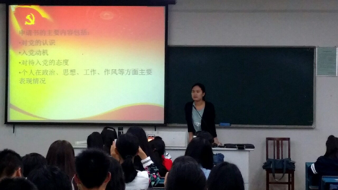 活动中,主讲人从对党的认识、端正入党动机、自觉接受党组织考察和培养及如何做一名合格的大学生党员、正确履行入党程序等方面进行了详细讲解;同时告知同学们怎样入党、入党的流程、入党申请书的撰写等。最后,她鼓励同学们在大学期间严格要求自己,好好学习,积极入党,尽快从思想上、行动上向党组织靠拢,争取早日成为一名光荣的中国共产党党员。