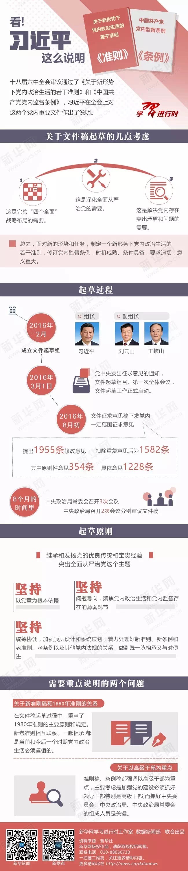 加强和规范党内政治生活、加强党内监督,都是新形势下加强党的建设十分重要的课题,也是我们推进全面从严治党的重要抓手。我们党抓党的建设,很重要的一条经验就是要不断总结我们党长期以来形成的历史经验和成功做法,并结合新的形势任务和实践要求加以创新。因此,有必要通过六中全会,对近年来特别是党的十八大以来从严治党的理论和实践进行总结,看哪些经过实践检验是好的,必须长期坚持;哪些可以进一步完善并上升为制度规定,以党内法规的形式固化下来;哪些需要结合新的情况继续深化。所以,党中央决定同时制定准则、修订条例,这是着眼于推进全面从严治党、坚持思想建党和制度治党相结合的一个重要安排。