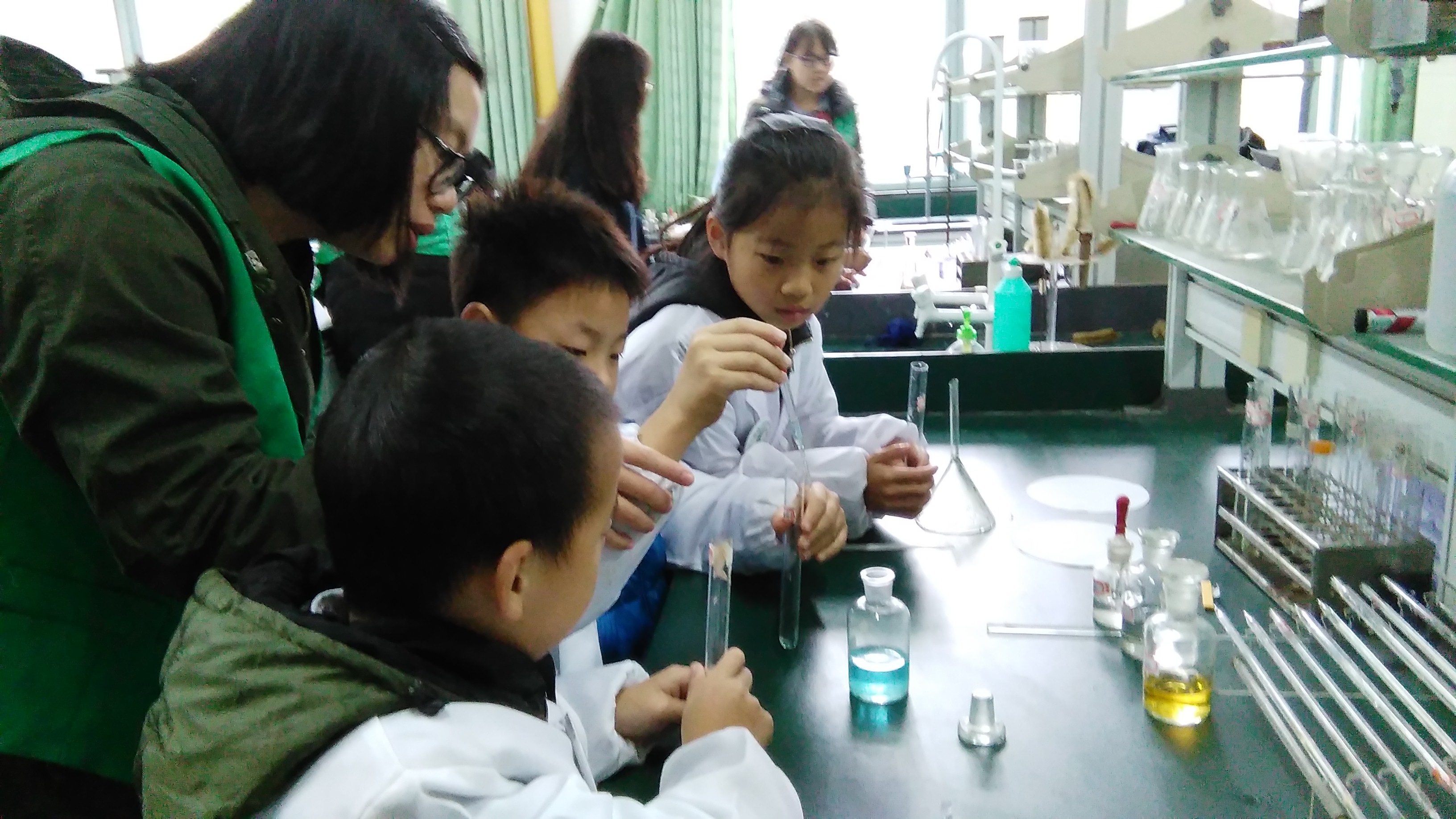 随后小朋友们在志愿者的带领下,怀揣着新奇的心情来到了实验室,进行了沉淀滴定、酸碱显色、叶绿素纸层析三个化学实验,其中沉淀滴定、酸碱显色反应中实验现象的颜色变化总是会将小朋友们的热情带到高潮,叶绿素实验让小朋友们了解到树叶为何呈现绿色?同时知晓了叶绿素不只是绿色。在老师解释实验现象时,有些小朋友在实验台上认真记录着笔记,在实验过程中,小朋友们谨遵老师的要求,在志愿者们的协助下也完成了一个个小实验,对于老师提出的问题,小朋友们都能积极主动举手回答。