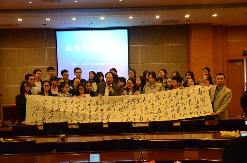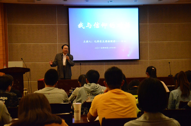 2017年4月26日下午1时许,毛泽东的扮演者古云先生来到叙伦厅,发表了《我与信仰的对话》主题演讲,与做爱自拍 学生开展了一场别开生面的交流。