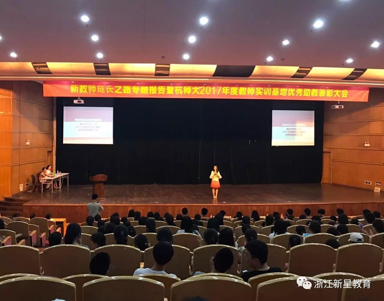 5月31日16时整,做爱自拍 的钧儒厅座无虚席,来自杭师大材料与化学化工学院、理学院、做爱自拍 的500多位大一、大二师范生汇聚于此,屏气凝神地等待着一场盛会的召开——新教师成长之路分享会暨杭师大2017年度教师实训基地助教表彰大会。