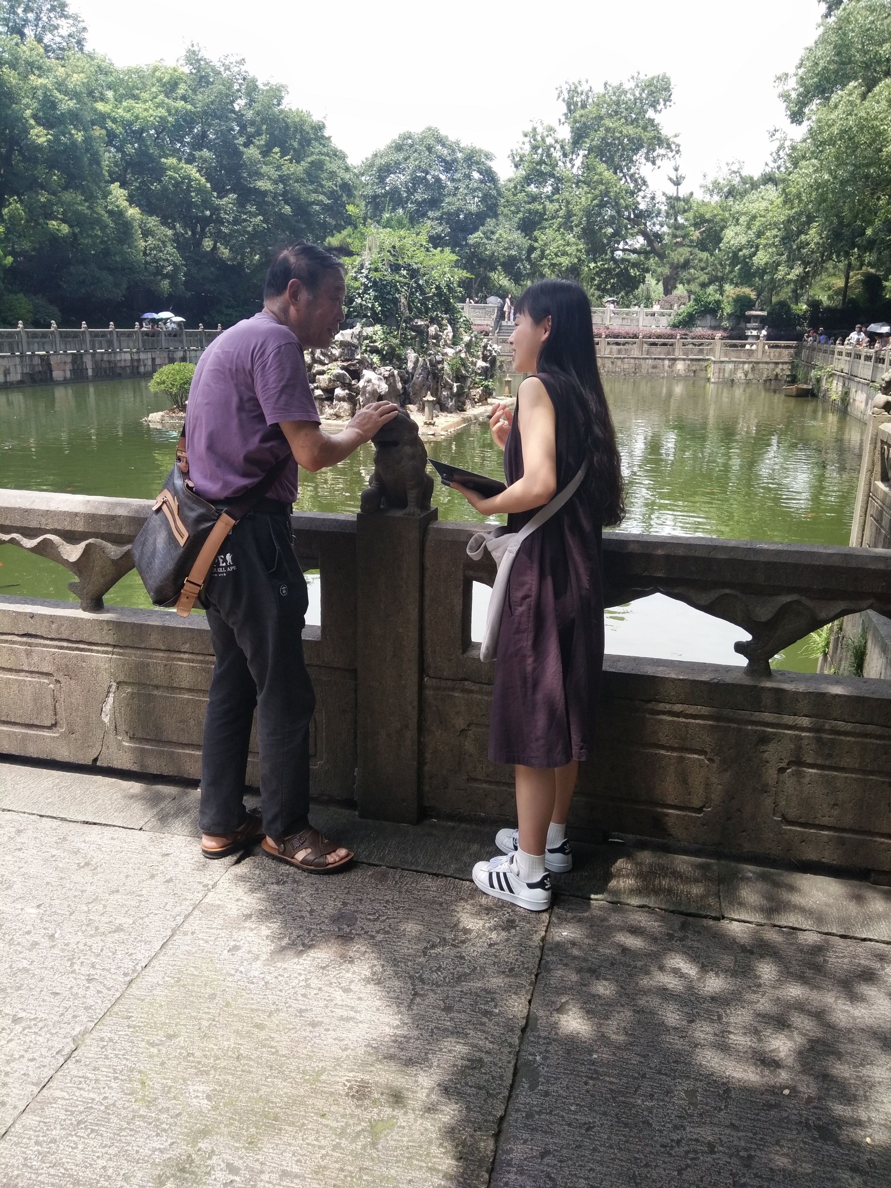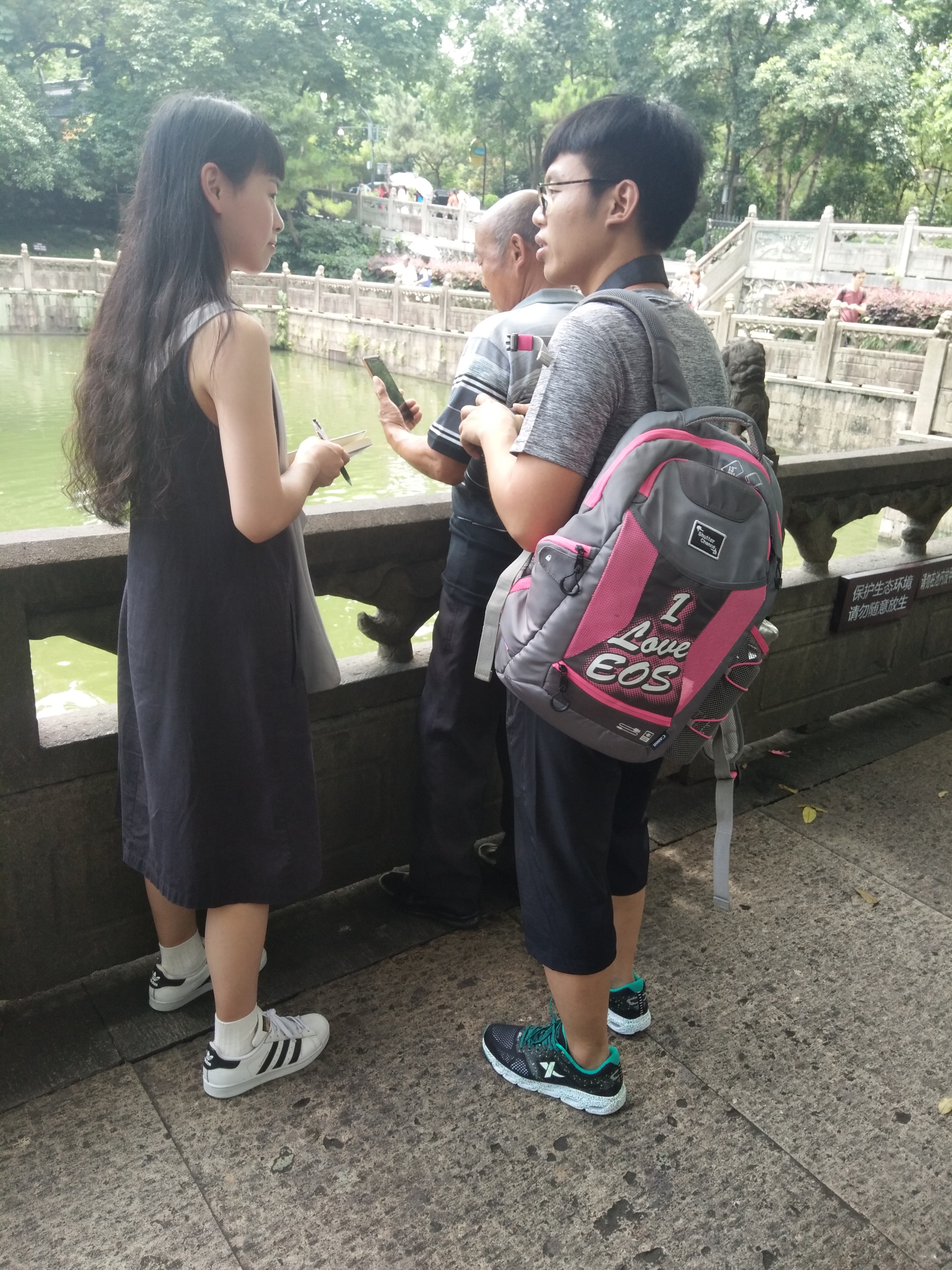 接着,她们对景区里的湖做了大致的观察和了解。一眼望去,湖水清澈见底,可以清晰地看见不同颜色的鱼在水里欢快地游来游去,也有几只小乌龟,爬到湖中央的小山上晒太阳,安逸的就像老爷爷坐在庭院里唠嗑似的。一路走过去,来来往往的游客甚多,她们对一些热情好客的游客进行了采访和提问,被接受采访的游客们一致认为,这里的水质还是值得称赞的,说以后要是还有机会的话,一定还要来这里看看。这让她们感到甚是自豪。最后,还与游客拍照留念并向他们表示感谢。