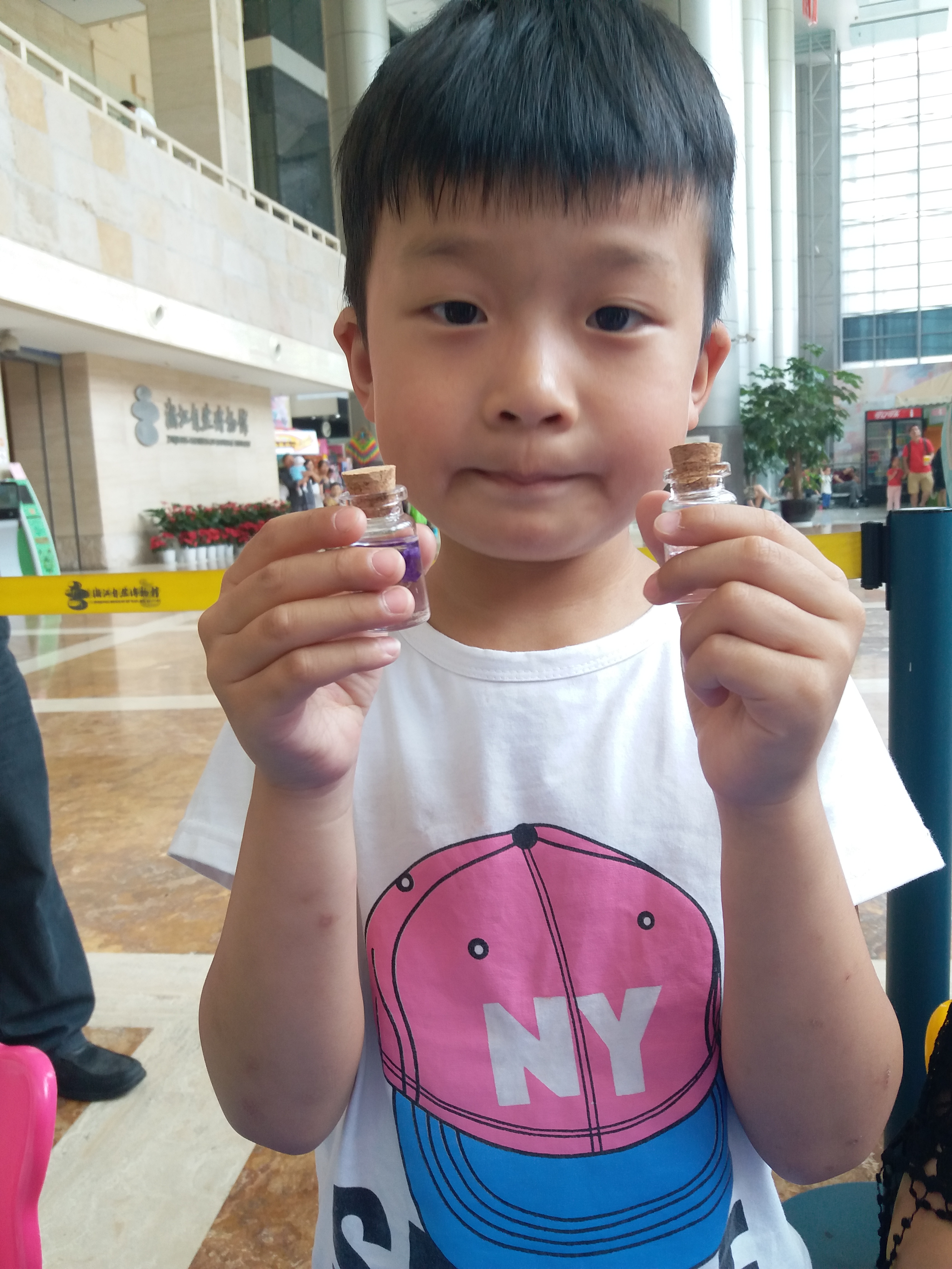 活动一开始就气氛高涨。大屏幕前有拿着麦克风认真讲解的主讲人,有和小朋友们坐在一起的现场教授人员,还有维持现场秩序的小分队成员。小朋友们有序的一排排坐在小桌子前,认真的听着主讲人讲解植物琥珀的PPT。因为本次活动不是针对成年人,和小朋友们交流更加需要耐心,所以成员在讲解时的措辞上也尽量地浅显易懂,将深奥的知识翻译成小孩子听的懂得语言,更能够帮助他们吸收理解。有一些活跃的小朋友甚至想要拿着话筒来讲讲自己对琥珀的见解。制作时,也不乏一些小朋友的提问,他们总是对未知的事物充满好奇,在探索求知的过程中不断丰富自己。他们自主选择喜欢的植物,将它们凝固在玻璃瓶中,保留住花朵短暂的美丽。因为活动的受欢迎程度,导致活动材料供不应求。到最后有不少小孩子都没有选到自己心仪的植物。但是在完成自己的制作之后,小朋友们都对自己所制作的东西感到满意,其实他们高兴地不是活动成果,更多的是兴奋于参与这个活动的过程。