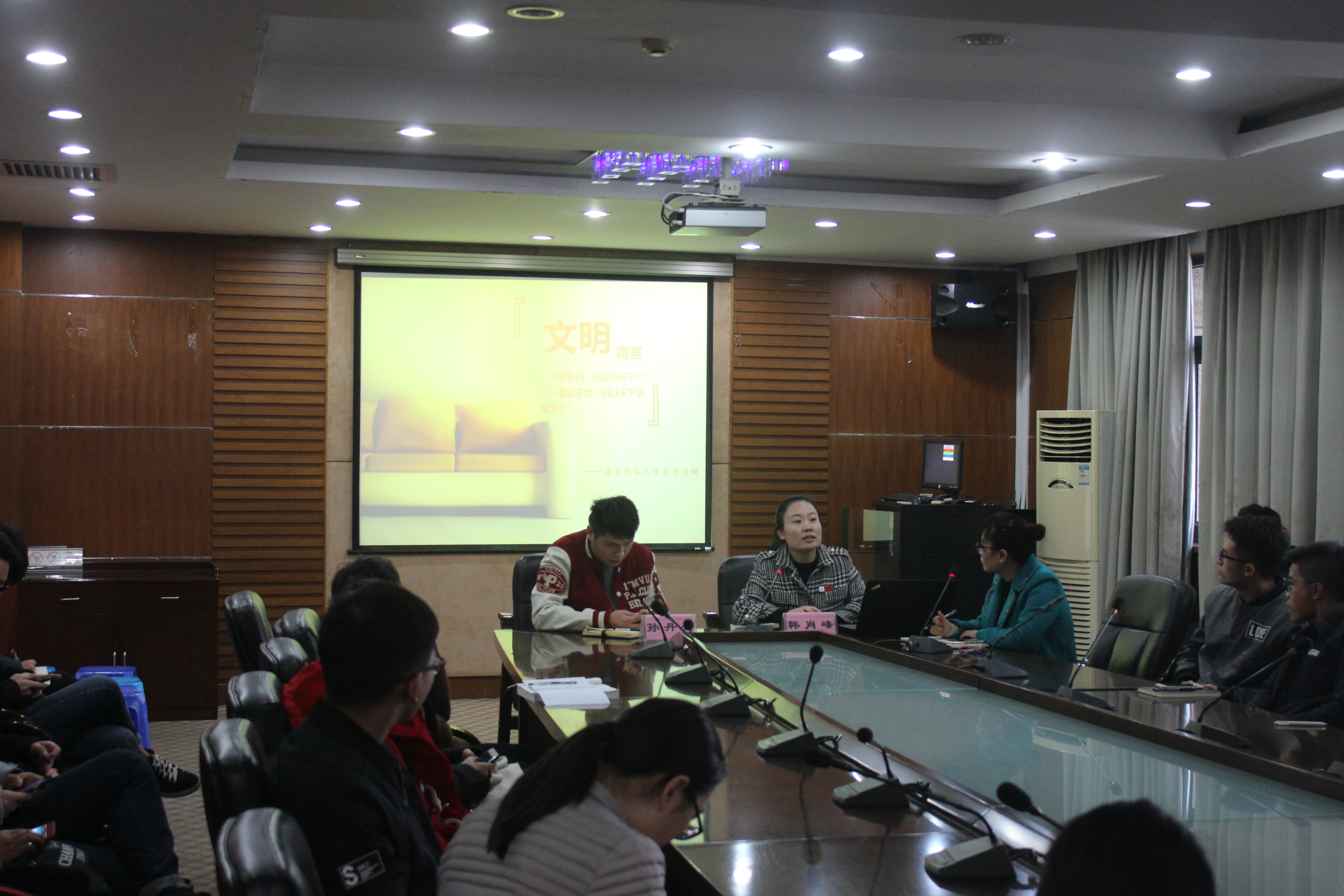 11月22日下午,为做好文明寝室建设,响应学校号召,做爱自拍 于行政楼422开展了“后勤与生科学子面对面”的活动。活动邀请到公寓服务中心副经理韩肖峰、下沙公寓部主任孙丹丹,为大家讲解文明寝室评分标准,同时解答学生的疑惑。