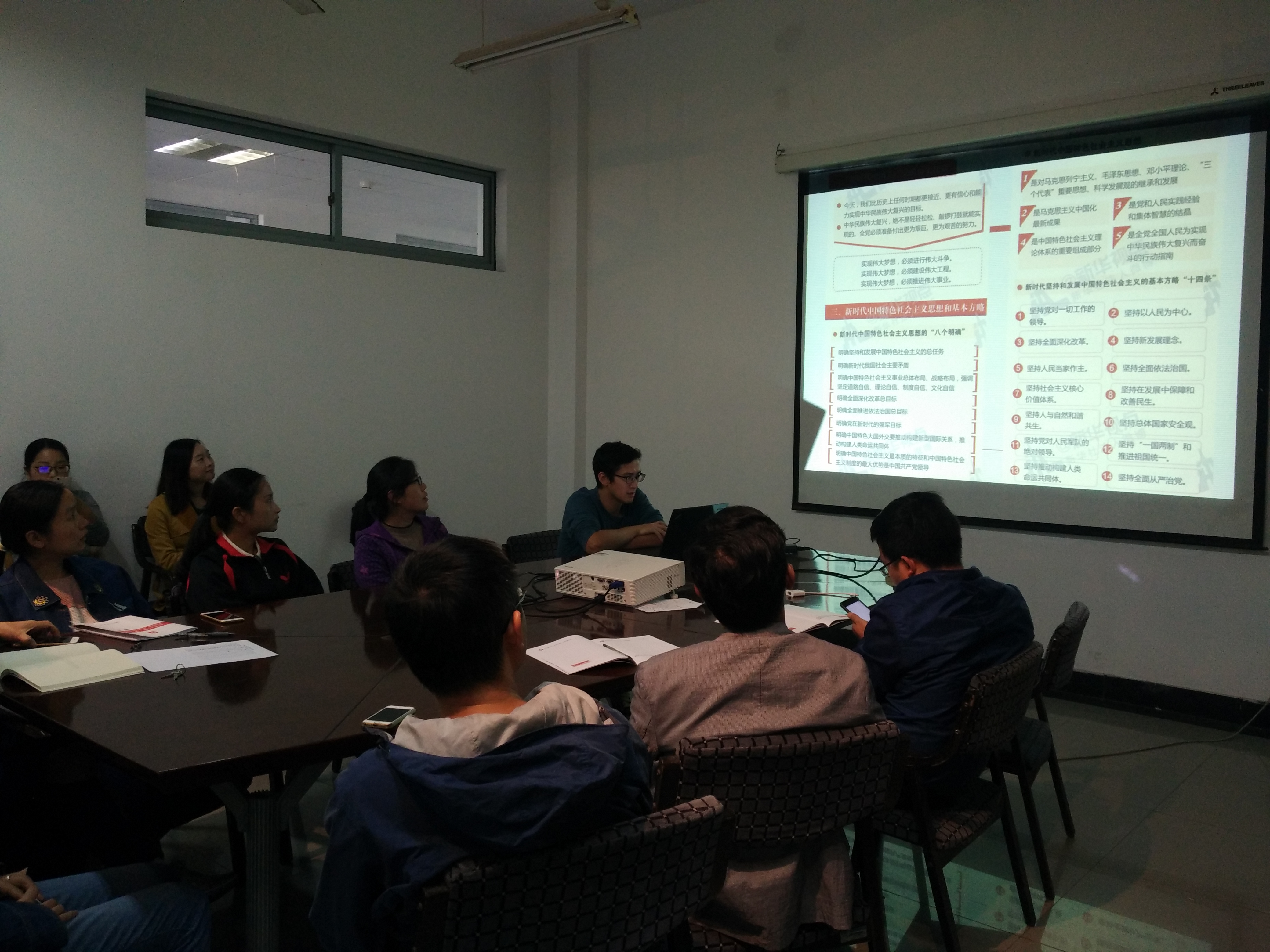 2017年11月15日,教工第四支部全体党员同志在本实验楼会议室进行了“继续深入学习习总书记十九大报告精神”的本月党员活动。支部书记赵晓枫同志按照图表形式归纳总结了“十九大报告”要点导图:一个主题、十大成就、两大变革、两个不变、一个使命、一个重要思想、两个百年、九方面指导……。活动中,广大党员同志联系实际畅谈了自己的一些感想,大家特别集中在对社会主义核心价值观个人层面的进一步认识与自身要求进行了广泛的发言。