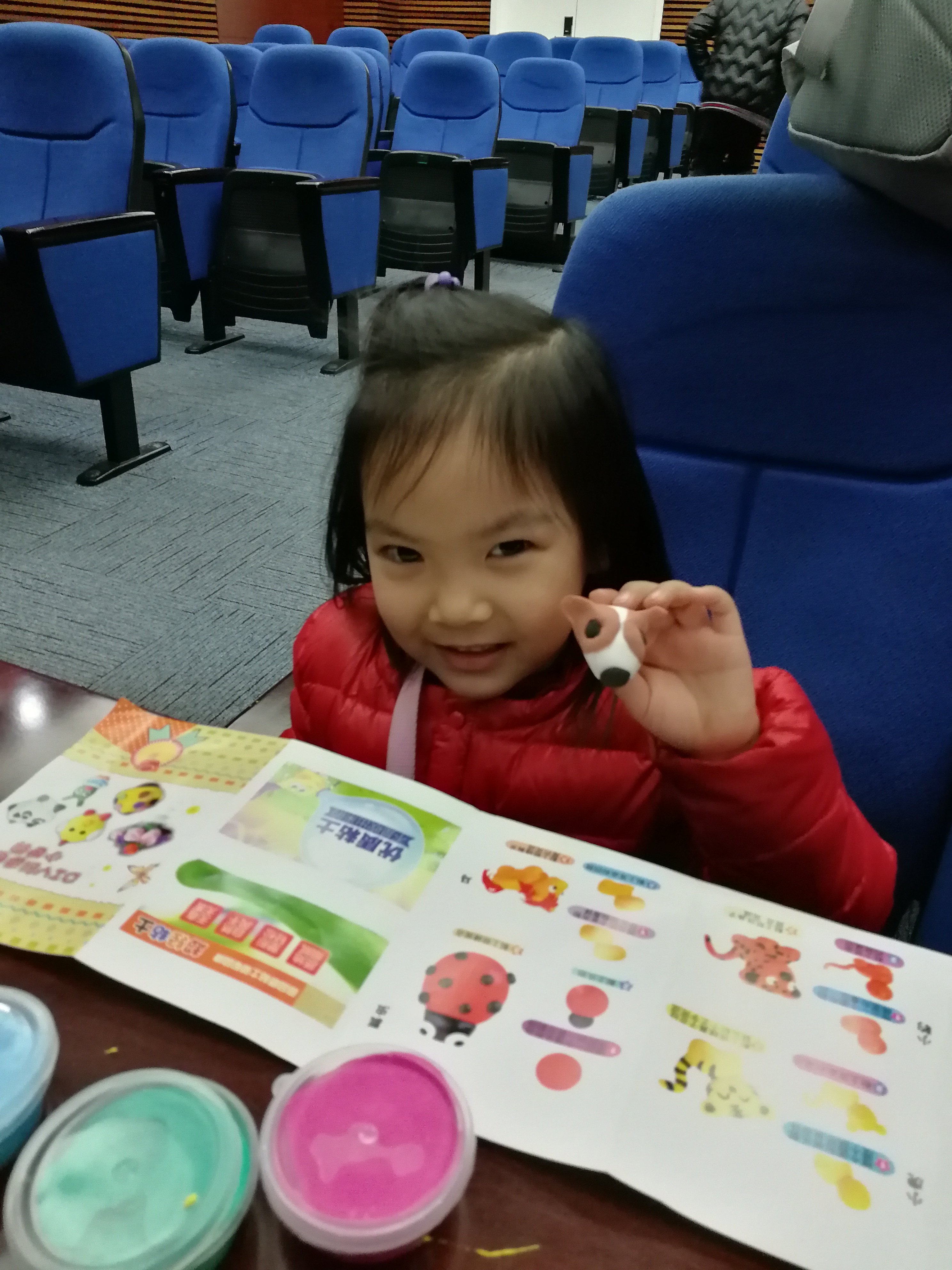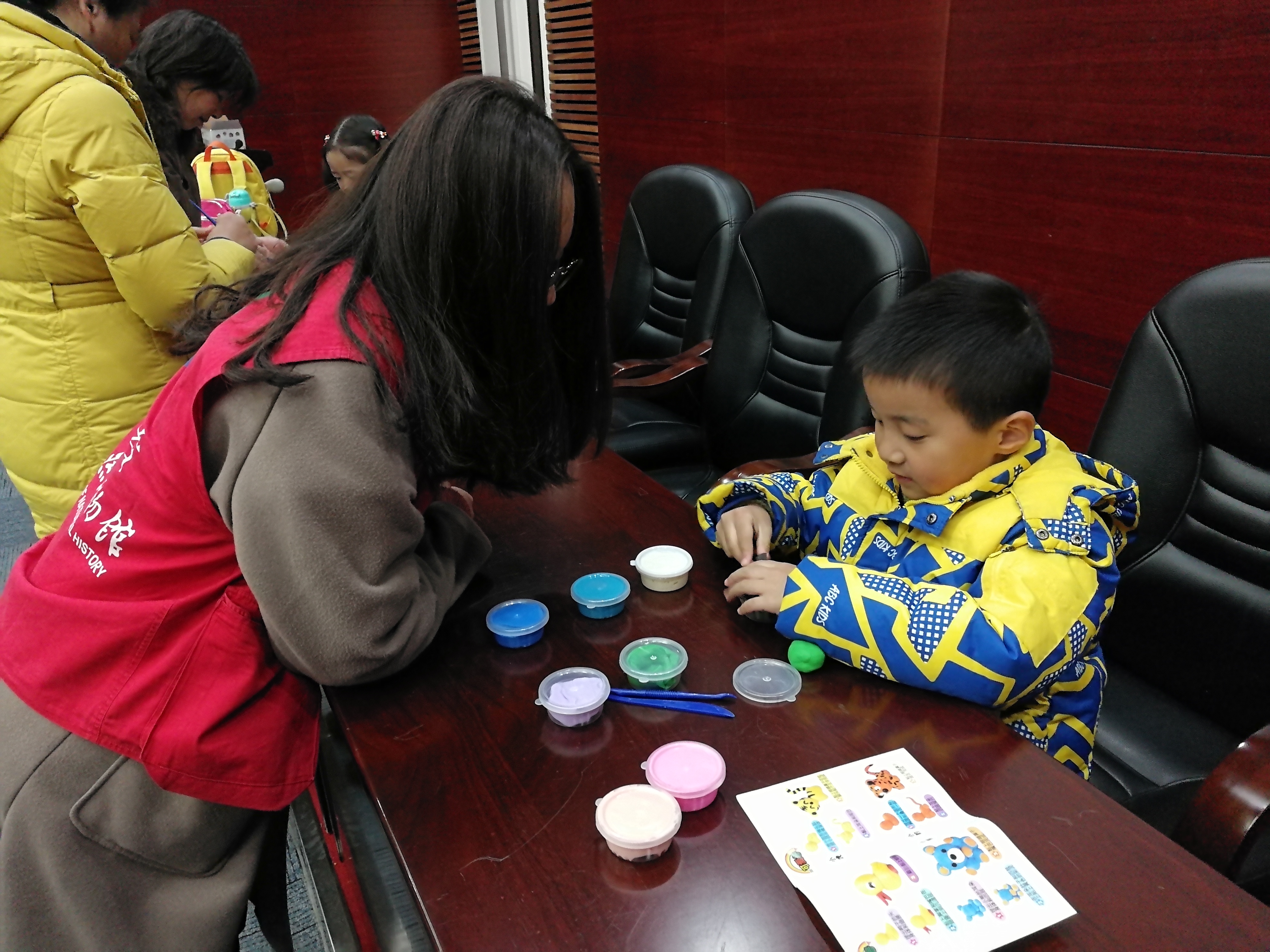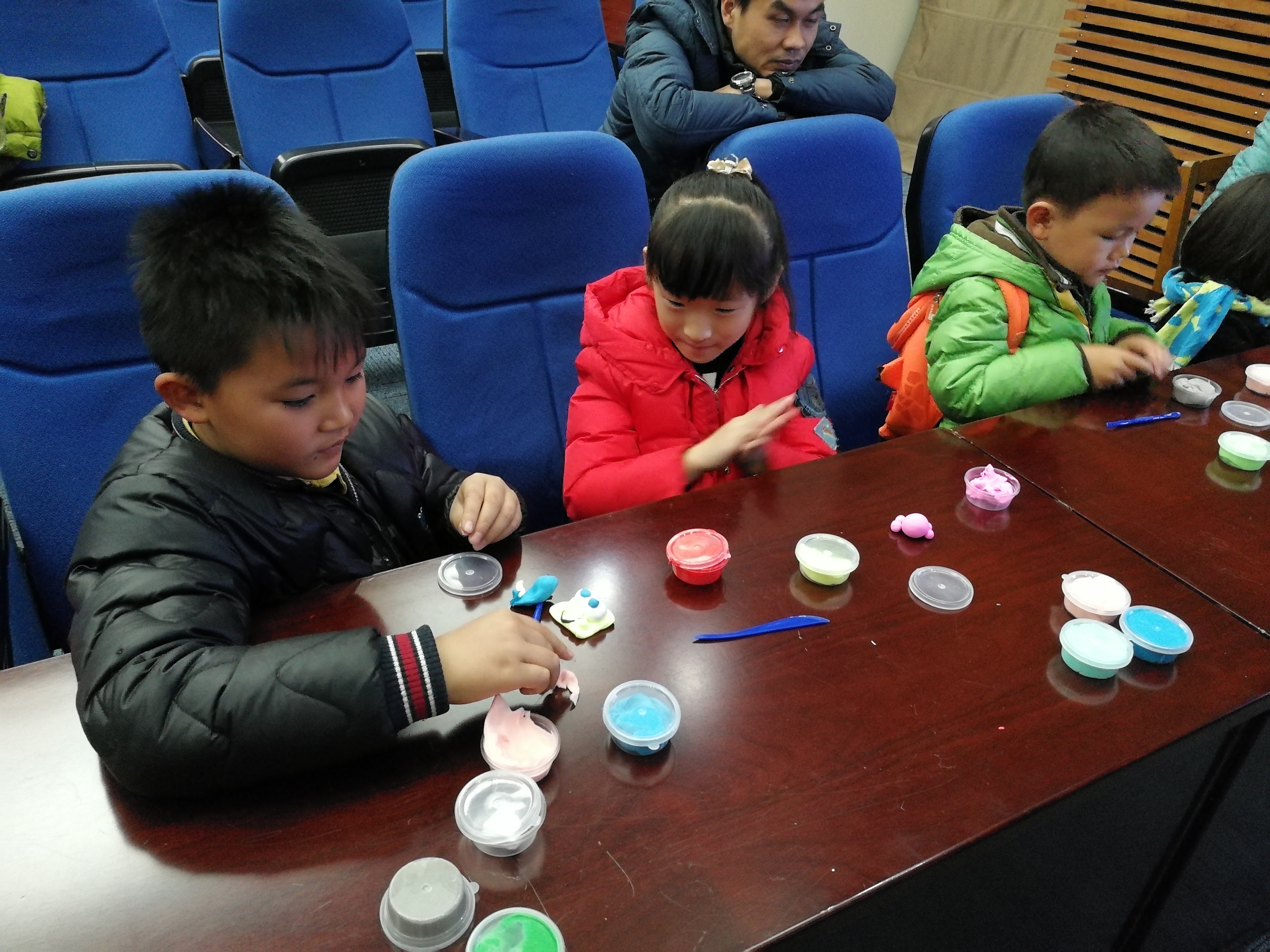 解说结束后就到了小朋友的动手时间,小朋友们在家长和志愿者的帮助下开始亲自动手制作黏土,活动正有序地进行着。制作过程中志愿者耐心地回答小朋友们的问题、引导他们完成黏土制作,并用手机拍下他们制作时的精彩瞬间。而充满想象力的小朋友互相分享不同颜色的黏土,创造出了海绵宝宝、小黄鸭、派大星……一个个生动形象的作品,志愿者们也根据小朋友的爱好随时为他们提供各种颜色的黏土材料。活动接近尾声,小朋友们开心地和父母分享自己的制作成果,并和各位工作人员和志愿者合影留念。