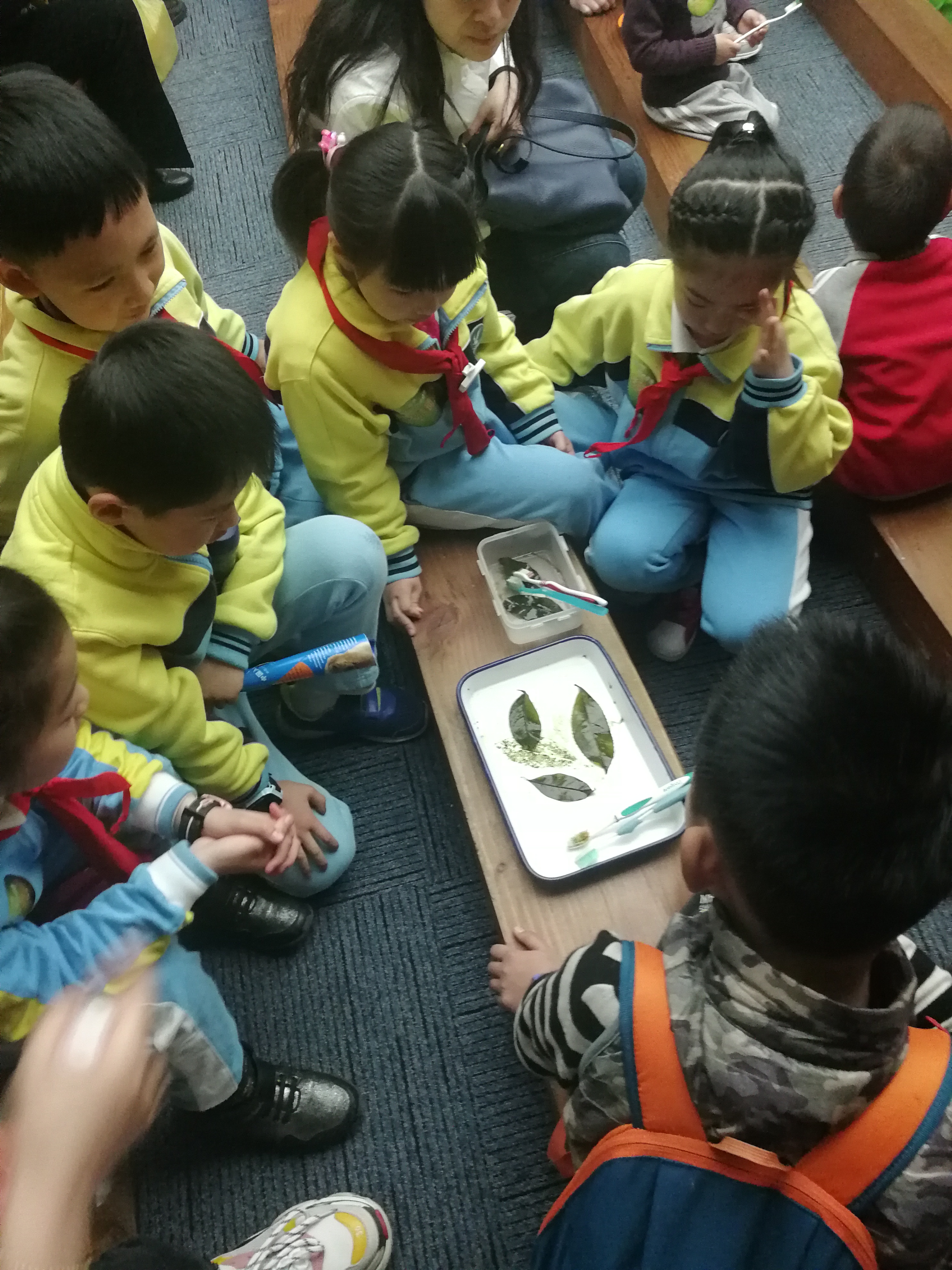 解说结束后就到了小朋友们的动手时间,尽管有些步骤小朋友们还没有完全理解,但在家长和志愿者的帮助下小朋友们都能顺利的洗刷桂花叶,活动有序地进行着。制作过程中志愿者耐心地回答了小朋友们提出的许多问题,比如“是什么树的叶子会有那么好看的颜色?”、“煮叶子的时候是加了什么才会让叶子上的颜色那么容易被刷掉?”,回答问题后,志愿者引导他们完成叶脉书签制作,最后用手机拍下小朋友们制作时的精彩瞬间。其中许多好学的小朋友甚至学会了自己将叶子干燥、封装。活动接近尾声,小朋友们开心地和父母分享自己的制作成果,并和各位工作人员以及志愿者合影留念。
