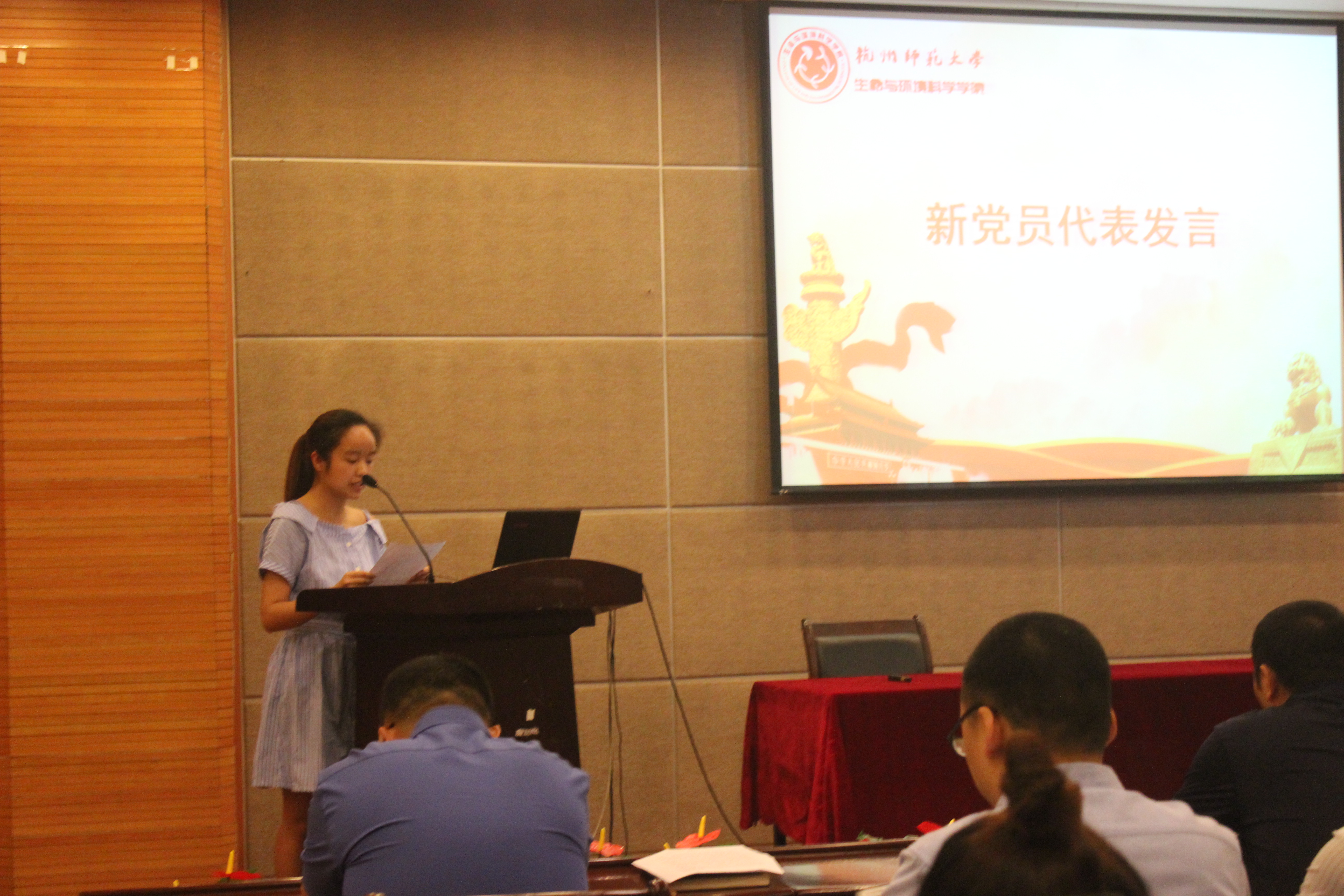 宣誓完毕,由新党员代表胡培琳同学发言。胡培琳同学让我们知道大学生不仅要努力学习专业知识,更要学会用积极乐观的态度去对待学习和生活中的各种困难。同时通过自身团委副书记的学生干部经历讲述了怎样做学习、工作中的领头羊。