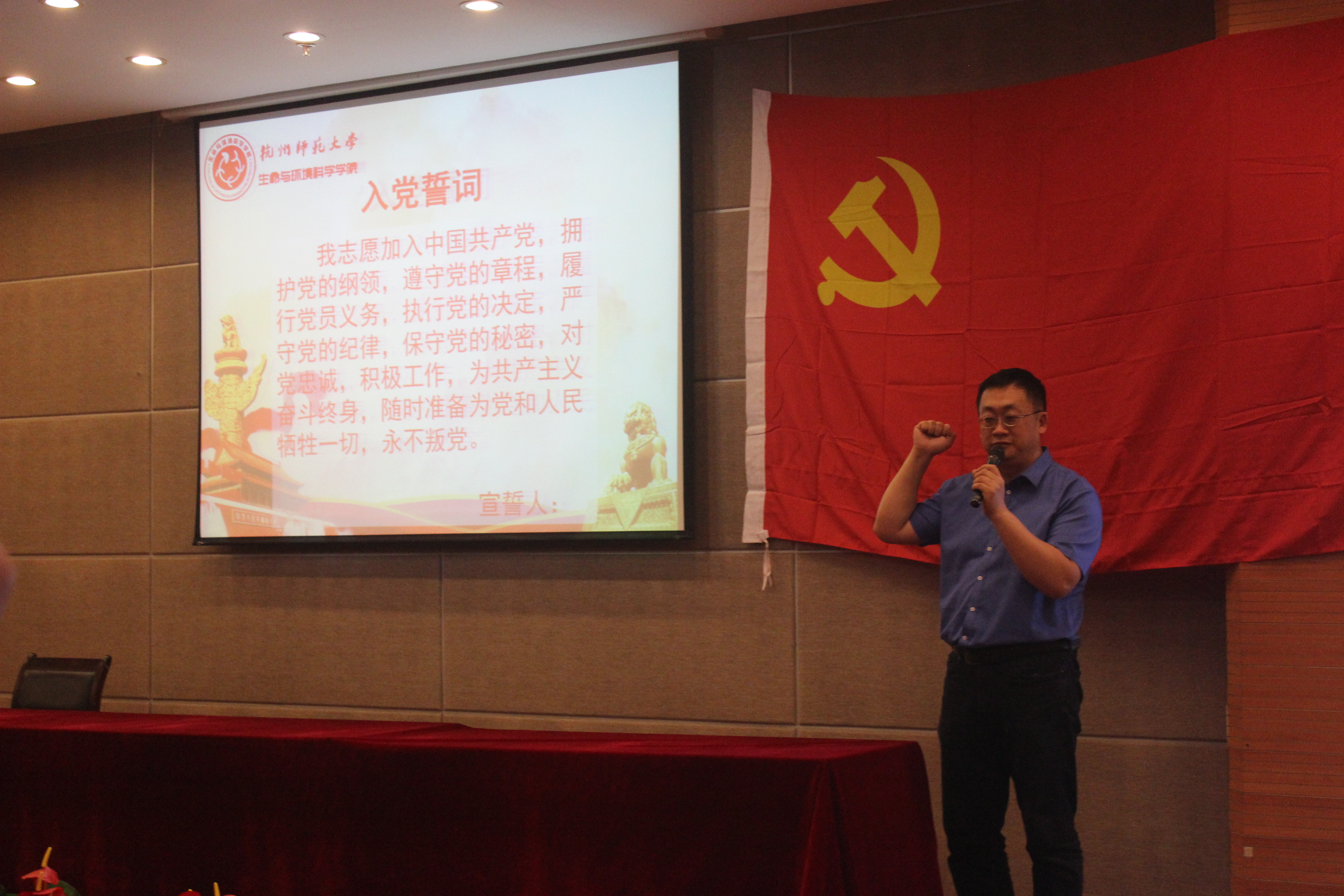 全体党员奏唱国歌之后,首先由院党委书记张杭君老师领读入党誓词。对于党员来说,无论是新党员还是老党员,入党宣誓的这个时刻,恐怕是这辈子都不能磨灭的记忆。入党宣誓,是党员政治生命开始的象征,更是一个人为共产主义事业奋斗终身的新起点。