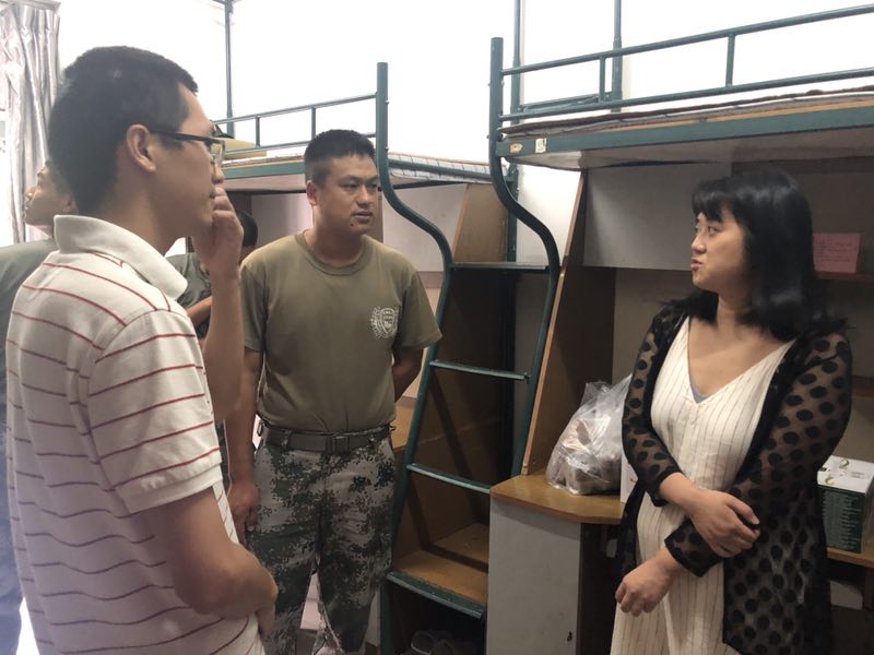 日前,做爱自拍 2018级本科新生军训正如火如荼的进行着,为深入了解新生军训情况,同时表达对军训教官的关切之情。2018年9月11日,做爱自拍 吕京京、岳龙华两位团委老师带领数名学生干部来到教官宿舍进行慰问。