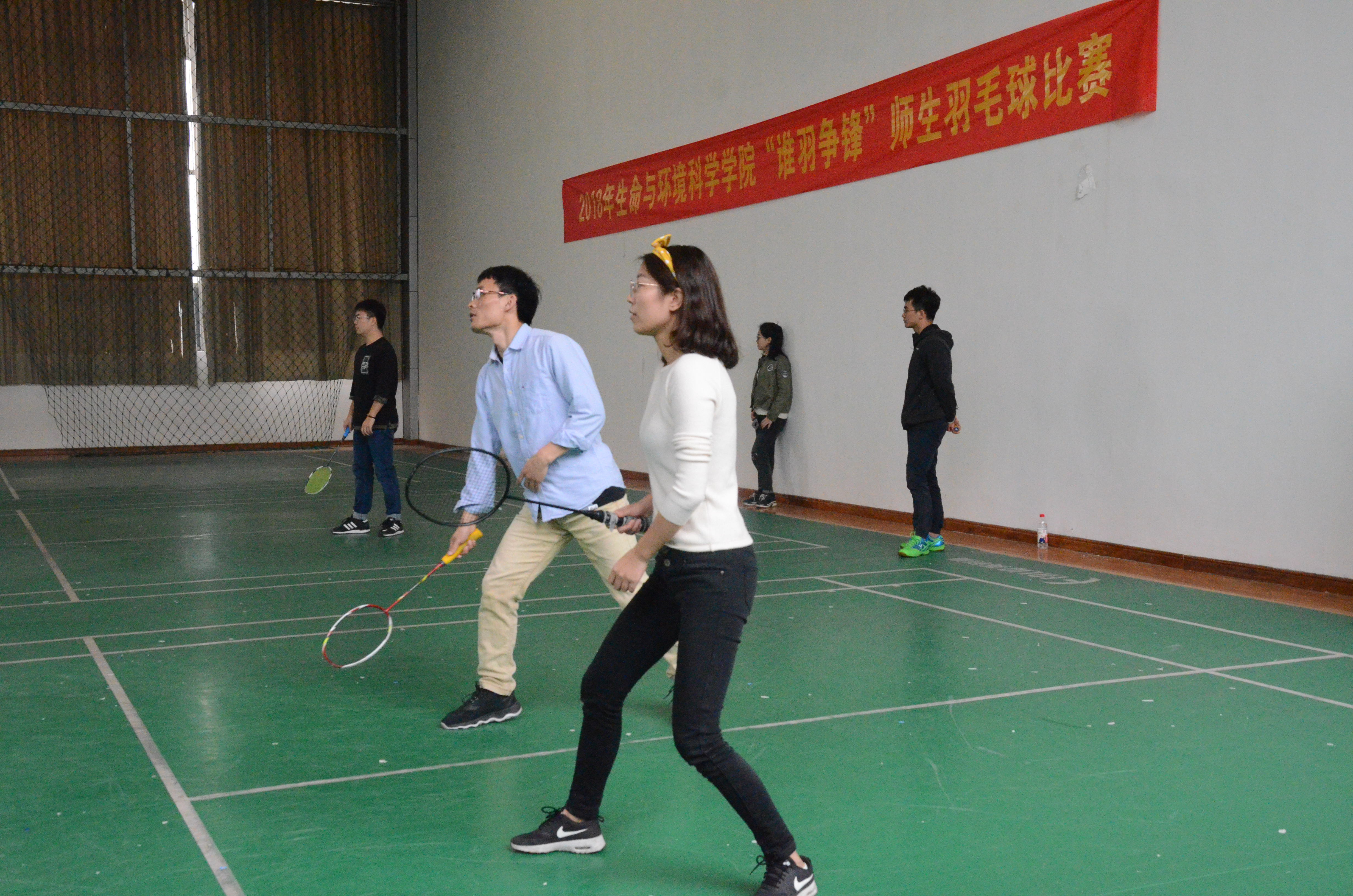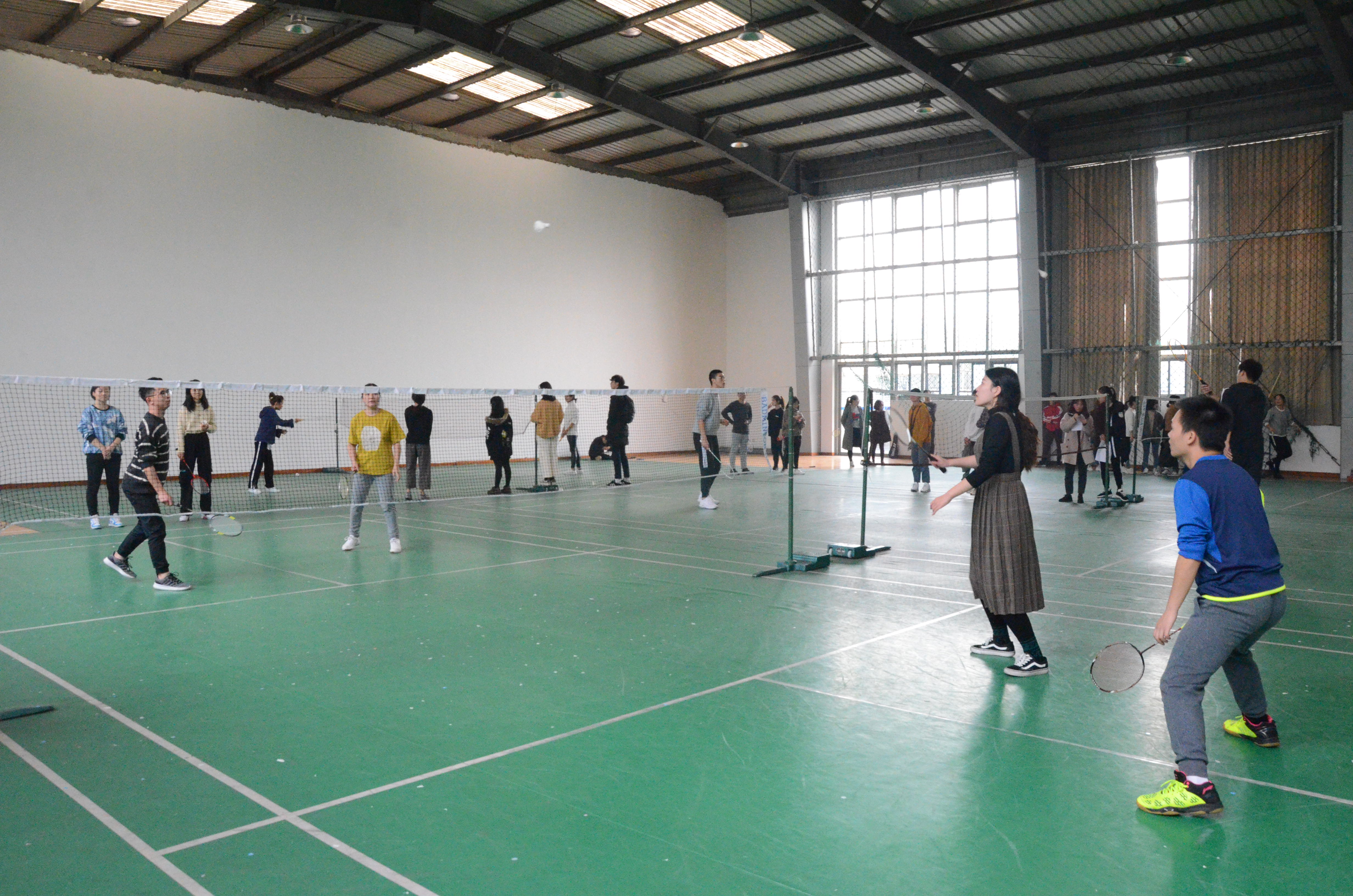 首先进行的是师生混双,每组老师与学生配合默契,丝毫不给对方有一丝机会可逞。在第一场比赛中郭庆学老师,一个挑球,扭转局势,引得全场的尖叫与欢呼,比赛进入高潮。全场都在屏息以待,究竟鹿死谁手。出人意料,郭庆学老师带领的小组遗憾败北。师生们经过观看第一组比赛得到的经验,在接下来的比赛中越来越默契,一个人错过球,另一个人立马反应过来,一个对勾角球便把对方给打的措手不及。
