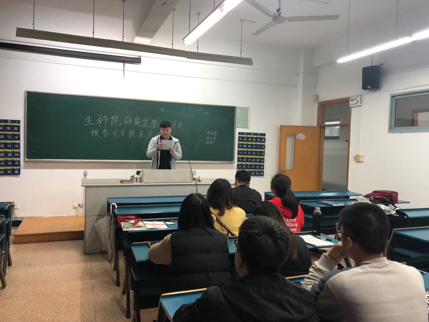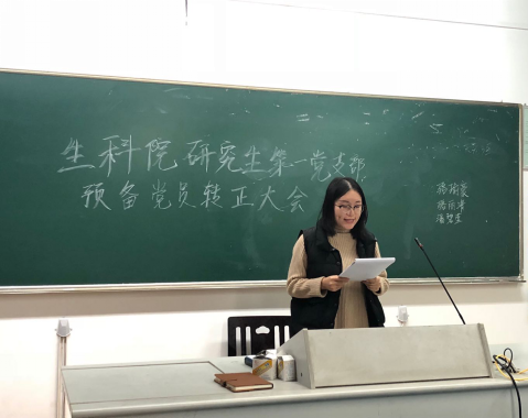 2018年12月3日16:50,做爱自拍 研究生第一党支部预备党员转正大会在教学楼a楼213准时召开。研究生第一党支部书记岳龙华老师出席并主持了本次会议。经过一年的考察,骆丽清、骆瑜豪、潘碧莹共三位同志通过支部大会讨论并按期转正。
