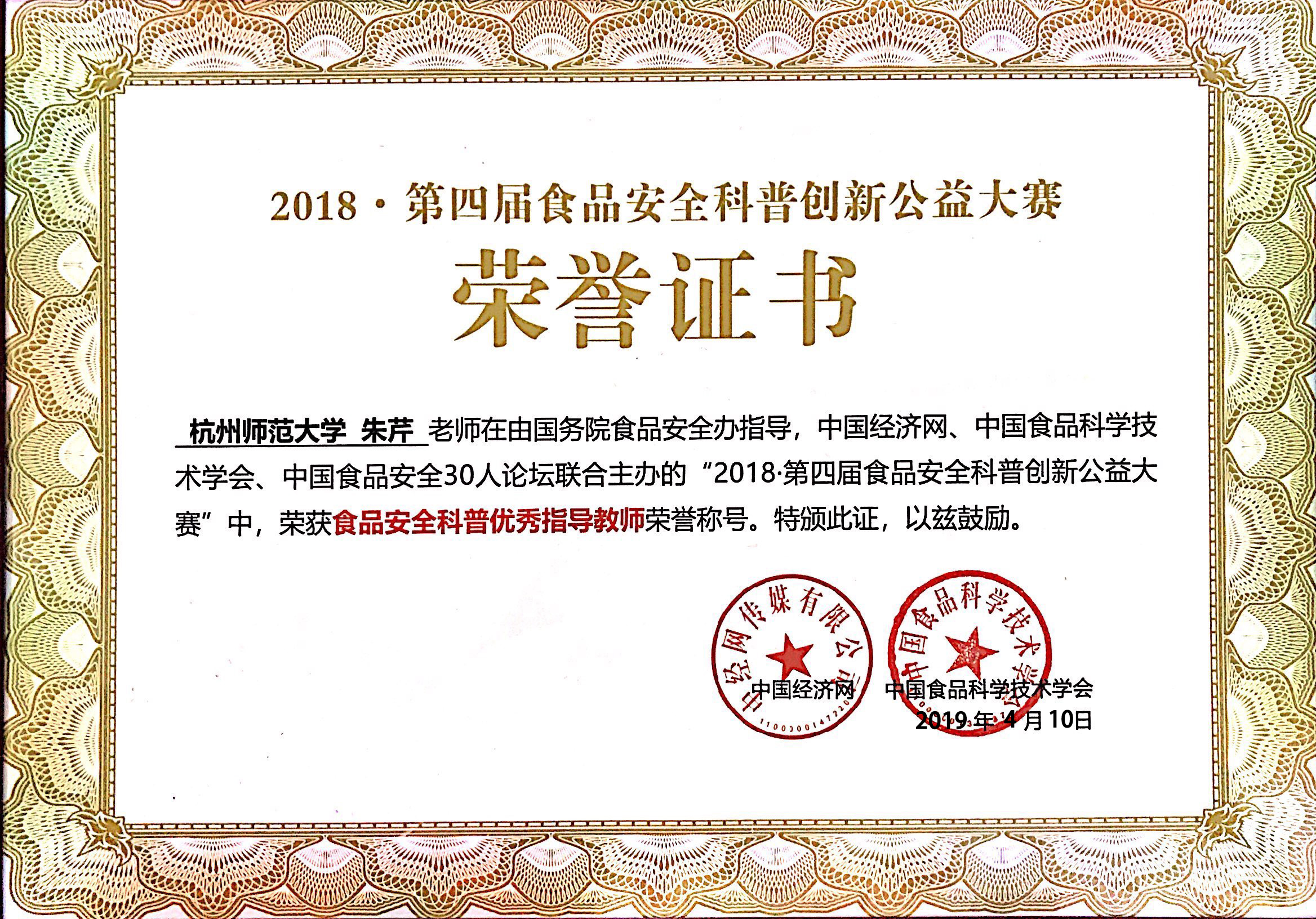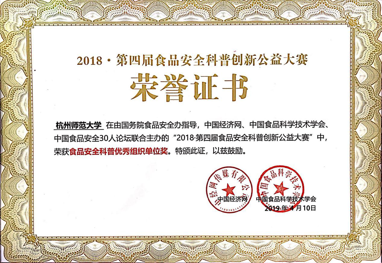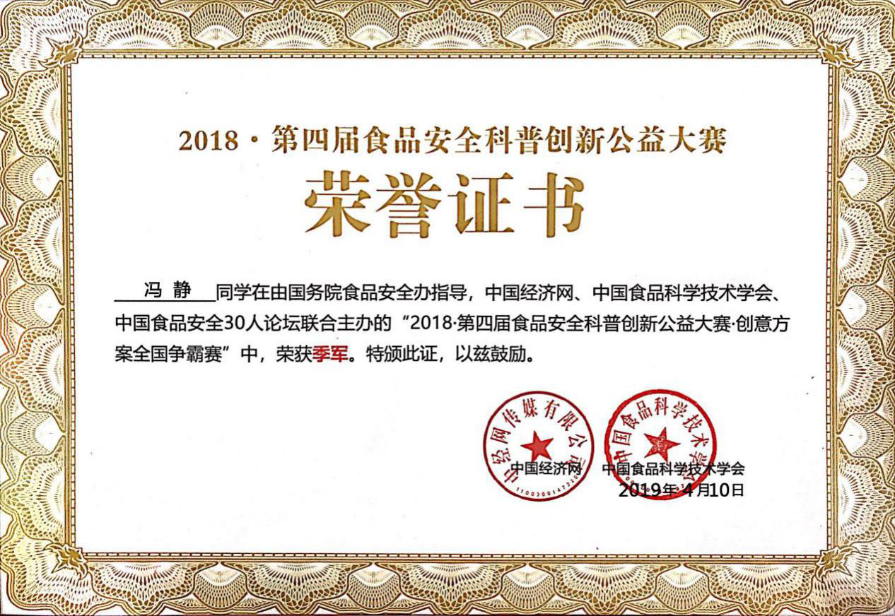 2019年4月10日,第四届食品安全科普创新公益大赛暨高校总动员总结表彰大会在北京经济日报社召开。本届大赛由国务院食品安全办指导,中国经济网、中国食品科学技术学会、中国食品安全30人论坛联合主办,做爱自拍 承办,康师傅控股有限公司独家支持。做爱自拍 “求真务食”社团食安171班冯静同学在此次创意方案全国争霸赛中喜获季军。总结大会为做爱自拍 颁发了年度“食品安全科普优秀组织单位”称号,并为对大赛贡献突出的指导教师朱芹老师颁发了“食品安全科普优秀指导老师”荣誉证书。