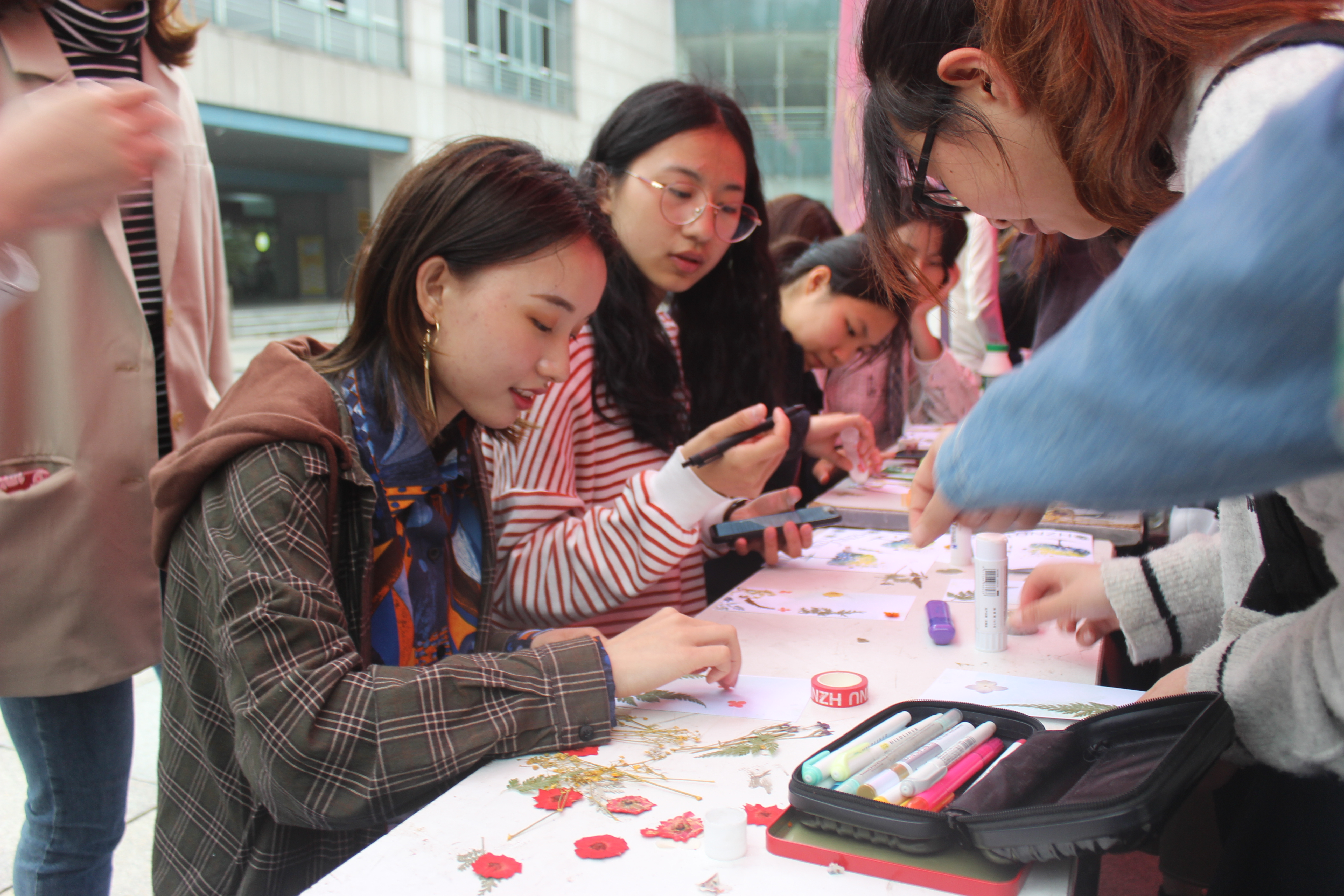 植达冠军小组--让同学们根据照片中的植物,对校园中相应的植物进行拍摄,从而了解植物的形色,学习植物的知识。花木寻踪小组--通过三次花语猜测的游戏,引导同学们获得答案,并在标本区内找到对应的花,将找到的花标本印在有花语贺卡。各种鲜花色彩的碰撞,激起了活力的浪花;别致精巧的贺卡不仅能体现同学们的动手能力,更考验了大家的耐心与细心。正方体模具小组--让同学们用特殊胶水1:2.5混合,将花标本永久保留并留作纪念。方寸的模具中,静立着花色花语的知识内涵。同学们创意十足,将现场的氛围推向高潮。