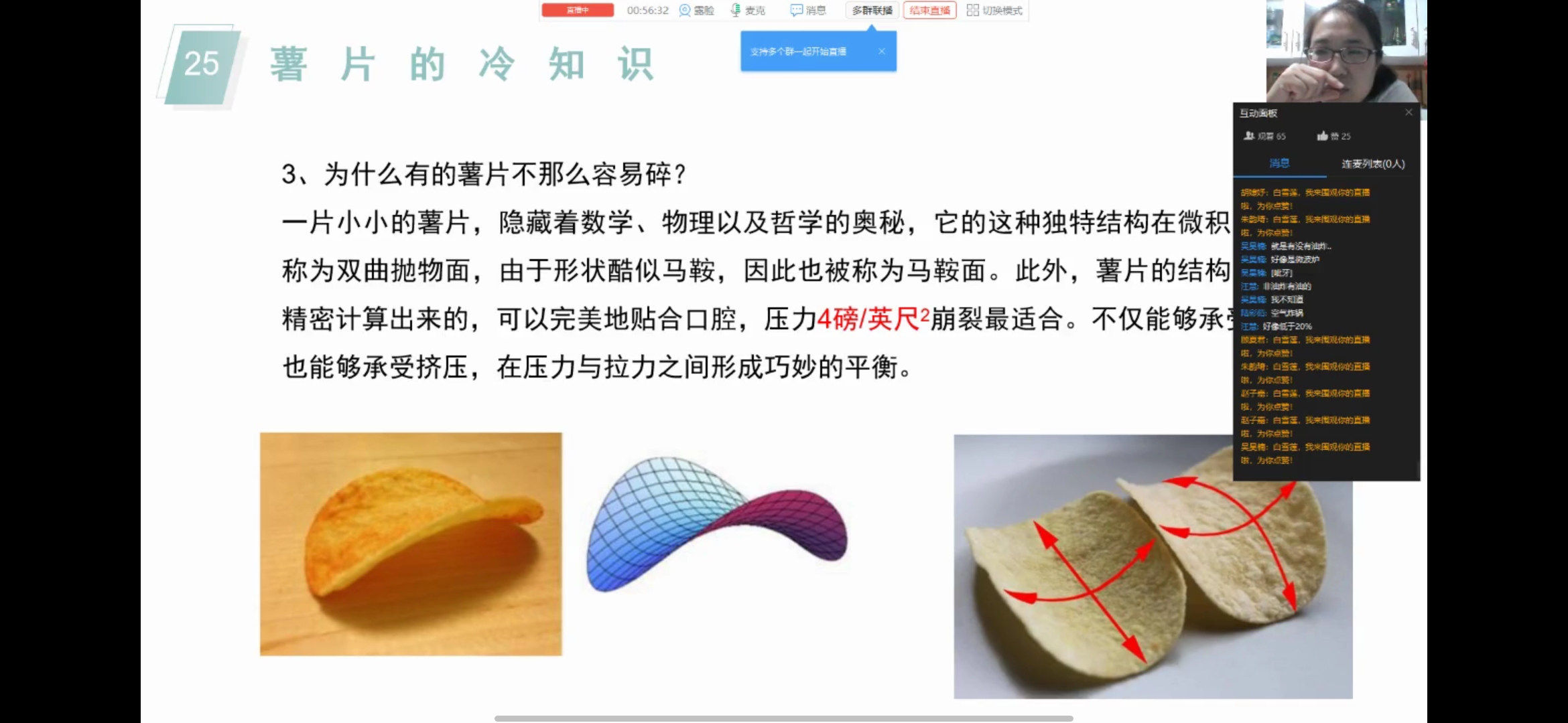 最后,老师讲述了薯片那些事,提到了一些关于薯片的冷知识,例如为什么有的薯片不那么容易碎?还讲了薯片的分类,有制作原料、加工方式、营房成分等分类方法。