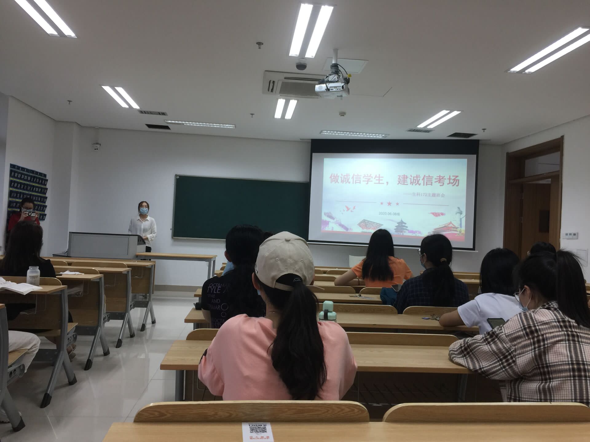 首先教务科老师向同学们介绍诚信考场的要求安排,确保同学们都了解诚信考场的运作规则,明确诚信考场设立的目的,并祝愿同学们取得好成绩。随后团委老师向办干部们再次强调了考风考纪的问题,特别强调了违纪的严重后果,也说明了一些可能出现的情况及应对方法。同时叮嘱班干部密切关注班级同学的心理情况,让同学们及时与辅导员联系,疏解考试压力。