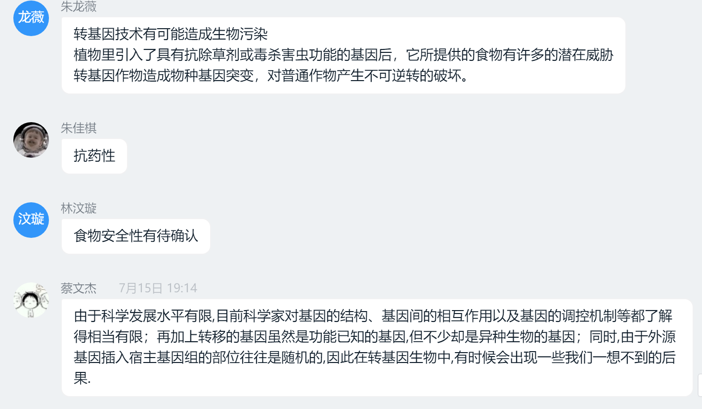 到了七点,主讲人陈艳同学在钉钉准时开始直播。首先,主讲人向我们介绍了本次宣讲的对象——转基因蚊子。在此基础上,插入了一个关于转基因蚊子的视频来引出转基因这个话题。本次宣讲共分为四块内容,在第一块内容中主讲人主要向我们介绍了转基因和它的背景,从基因入手再来到转基因的概念以及进行转基因的基本操作。在宣讲过程中,主讲人抛出了转基因利弊的问题,观众们也在钉钉群中对此进行了激烈探讨。此外,对于转基因知识的科普,观众们都积极参加了互动,提出了自己对转基因的看法。