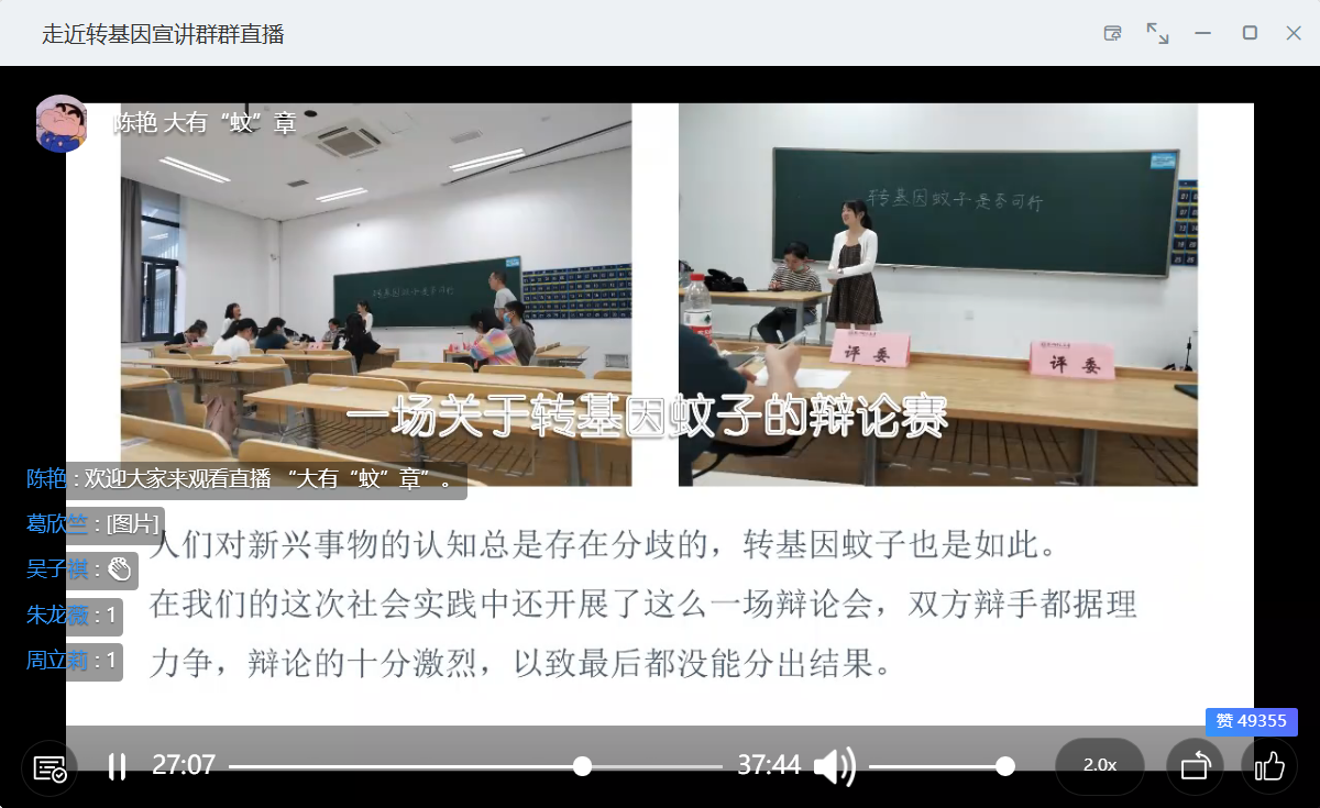 为了让群众真正认识转基因、走近转基因,增强群众明辨是非的能力。“走近转基因”社会实践小队以钉钉直播的形式举行了以大有“蚊”章为主题的宣讲活动,参加本次宣讲的人员有来自校内外各年龄阶段的人群。本次活动的主讲人员是陈艳同学,PPT制作者是蔡文杰同学。