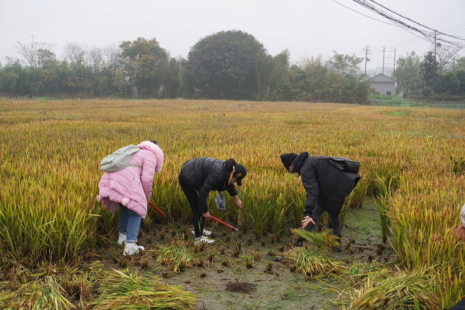 到达目的地后,只见田间一片金黄,稻穗上缀满了沉甸甸的稻谷,处处洋溢着丰收的景象。古语说:“春种一粒粟,秋收万颗种。”那么割稻你行不行呢?田园伯伯先给大家做了割稻谷的示范“左手捏紧谷穗,右手镰刀刀口朝下割,下镰要准,收镰要快”。随后,大家纷纷摩拳擦掌、跃跃欲试,领取镰刀后就上了“战场”。有些同学上手很快,熟练地割着稻谷,每割一把就有条不紊将其放在身后的田沿边;有些同学却出师不利,直接将稻谷从土中连根拔起,但在农民伯伯的悉心指导下也逐渐得心应手。虽然在活动时天公不作美,下着淅淅沥沥的小雨,但大家依旧干得有模有样、热火朝天,共同体验田间劳作的乐趣。