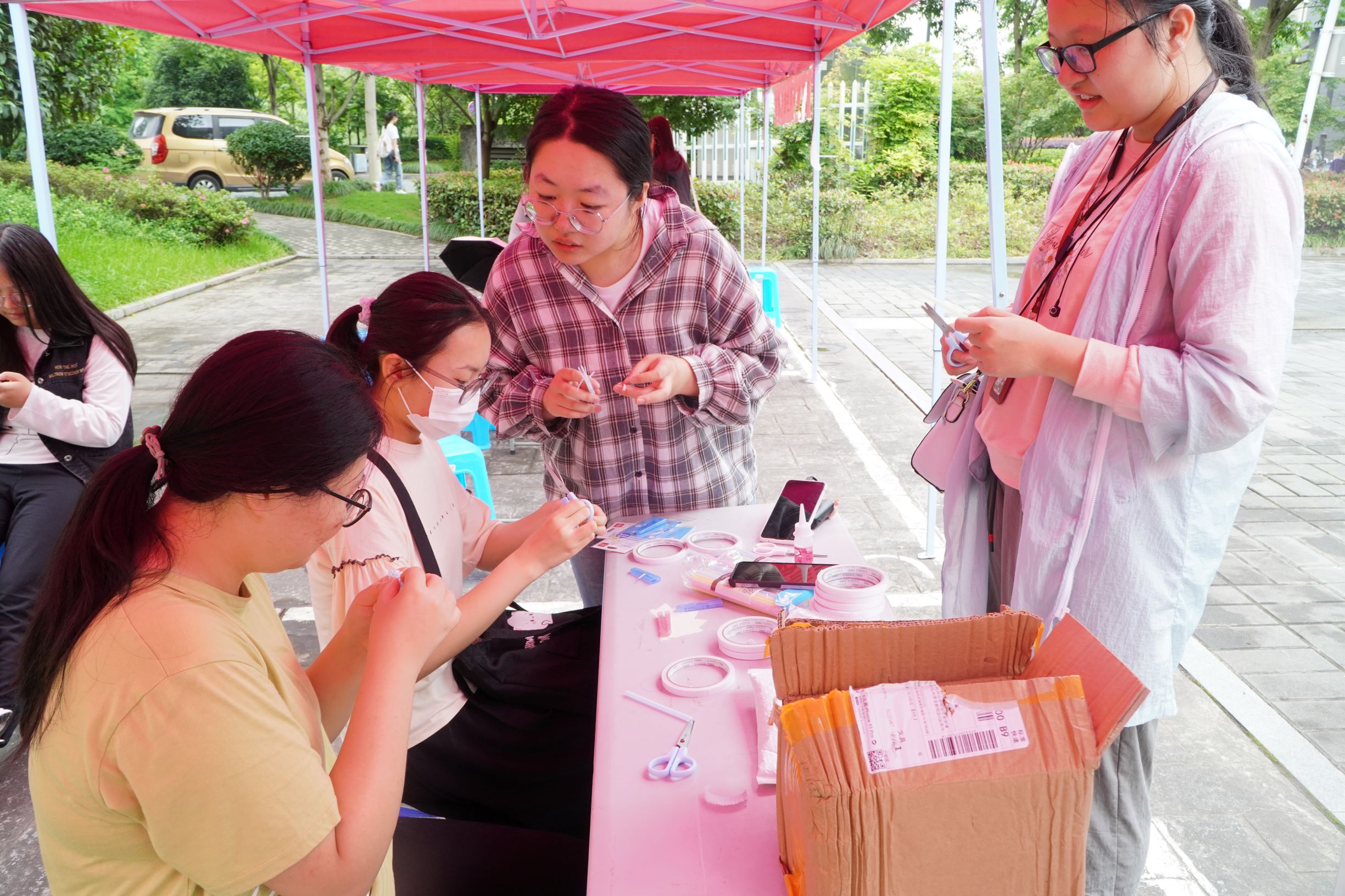 在制作的过程中,同学们有的专心致志地制作,有的与身边的同学进行探讨,研究一些物品的制作方法,而还有些同学很迅速地组成团队进行合作,制作速度十分迅速。