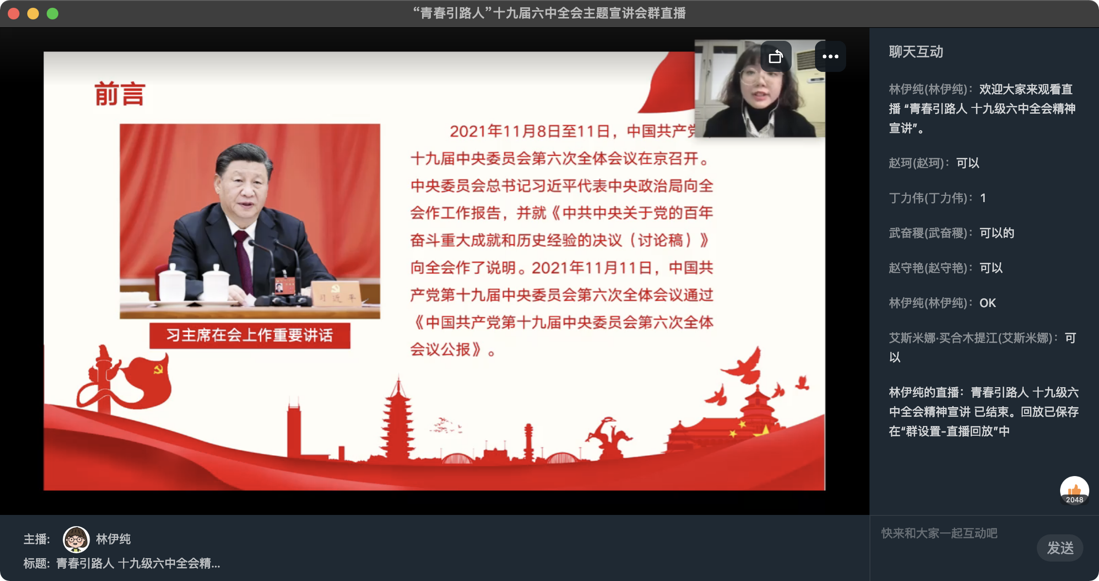 为引导广大学生深入学习党的十九届六中全会精神,2022年1月5日下午,做爱自拍 面向全体2021级本科生,特邀请人文学院林伊纯老师开展线上主题宣讲活动,活动由辅导员孙天一老师主持。