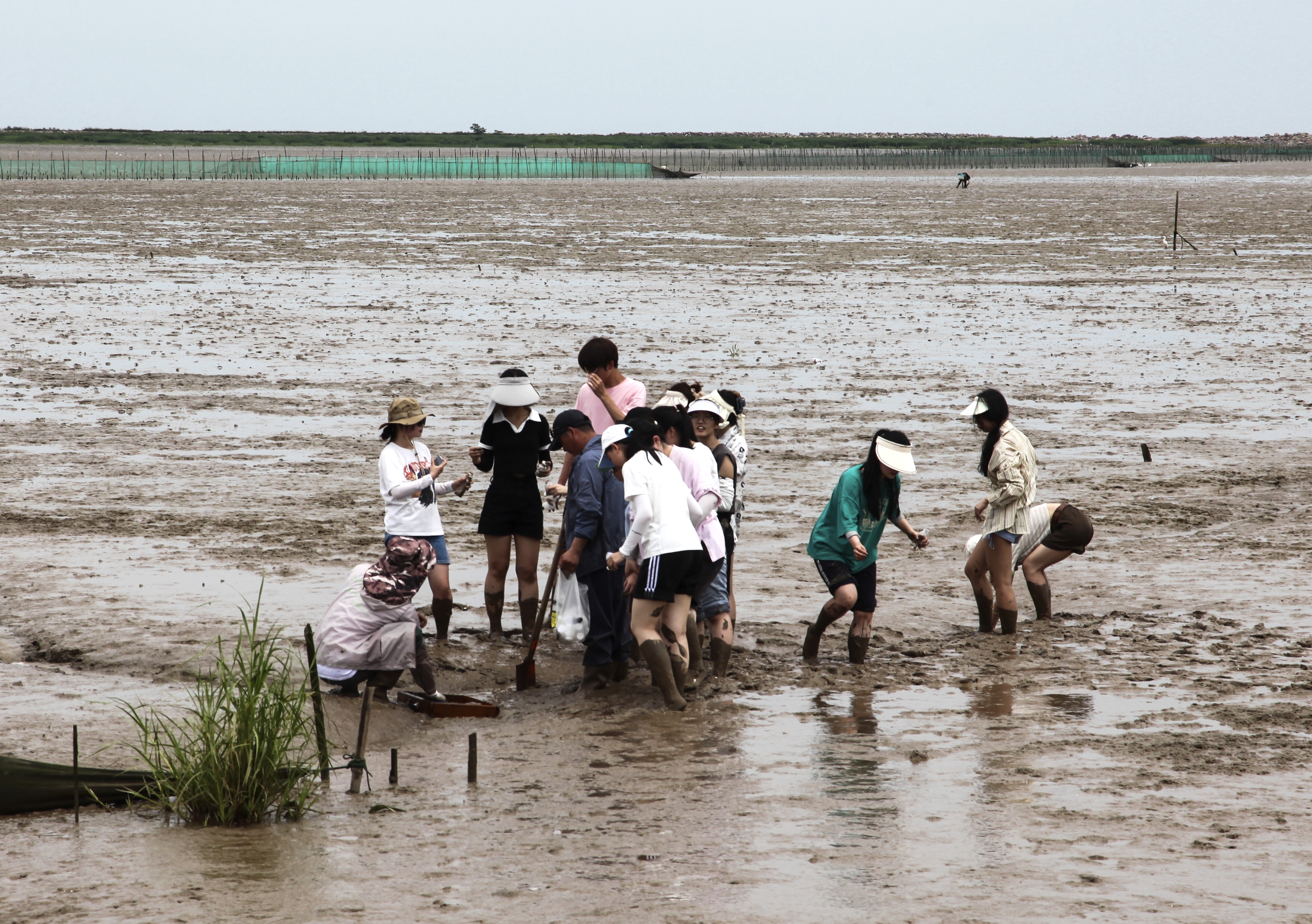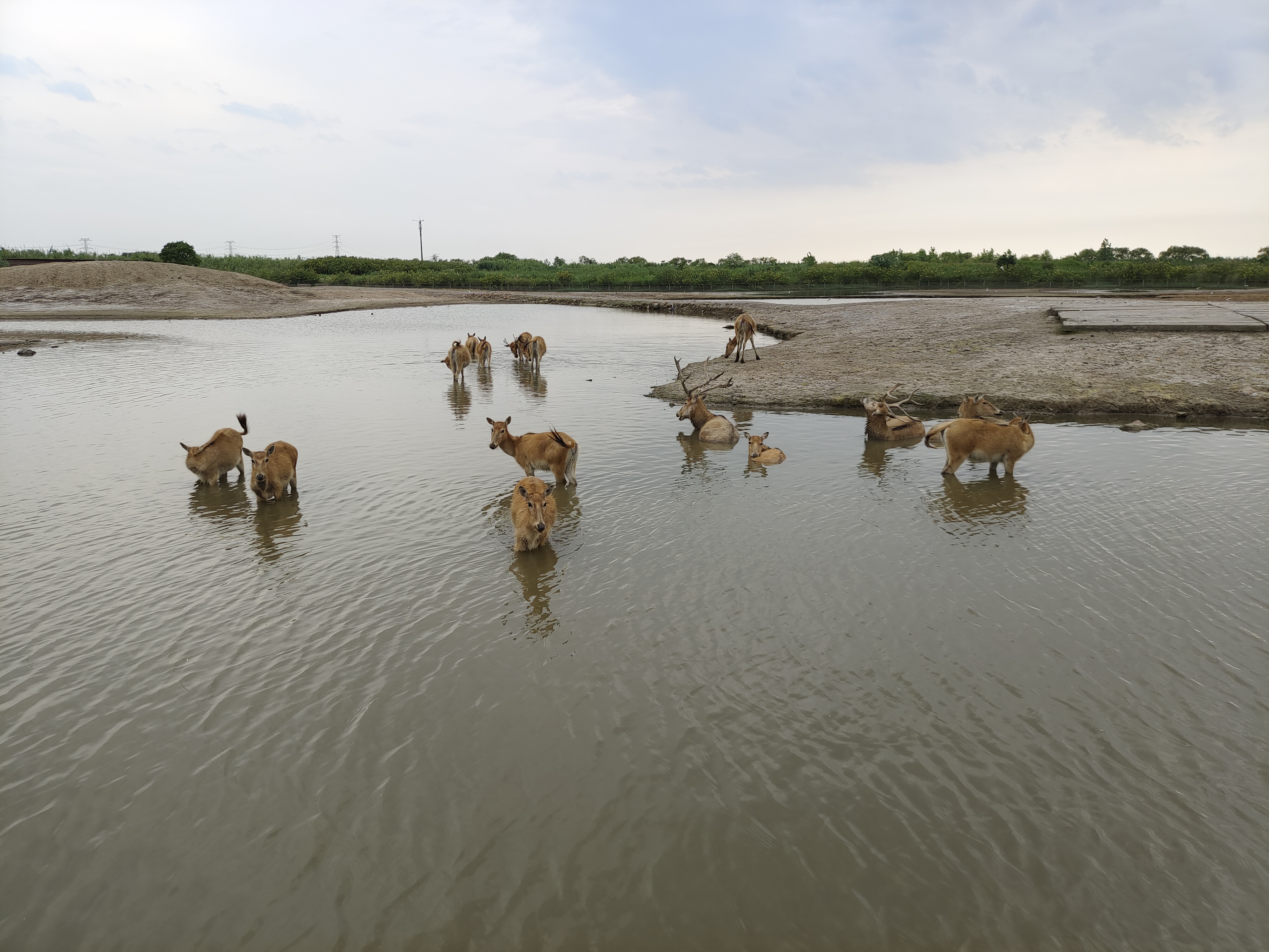 实习的最后一站,同学们来到了浙江杭州湾湿地生态系统国家定位观测研究站。在研究站老师的指导下,同学们脱去鞋袜、带上铲子和大筛网相互搀扶着来到泥质柔软、物种多样性较丰富的滩涂湿地,学习底栖动物的采集、鸟类的观测和相应的调查方法(图5)。午后,实习队伍来到研究站基地,在基地工作人员的介绍下,同学们参观了拥有丰富鱼类、昆虫和鸟类标本馆藏的标本馆,标本做工精美、栩栩如生。随后,同学们依次坐上观光车、观光船,近距离领略了杭州湾湿地公园的自然景观。园内物种多样性丰富,且目前正值部分鸟类的繁殖期,在郁郁葱葱的树林草丛间,大、中、小白鹭翩然起舞、引吭高歌;在麋鹿码头,壮硕的麋鹿悠然徜徉在水间,与偶尔落在不远处的黑翅长脚鹬、弯嘴滨鹬和其他鸟群相呼应,形成一幅和谐的湿地生态画卷(图6)。