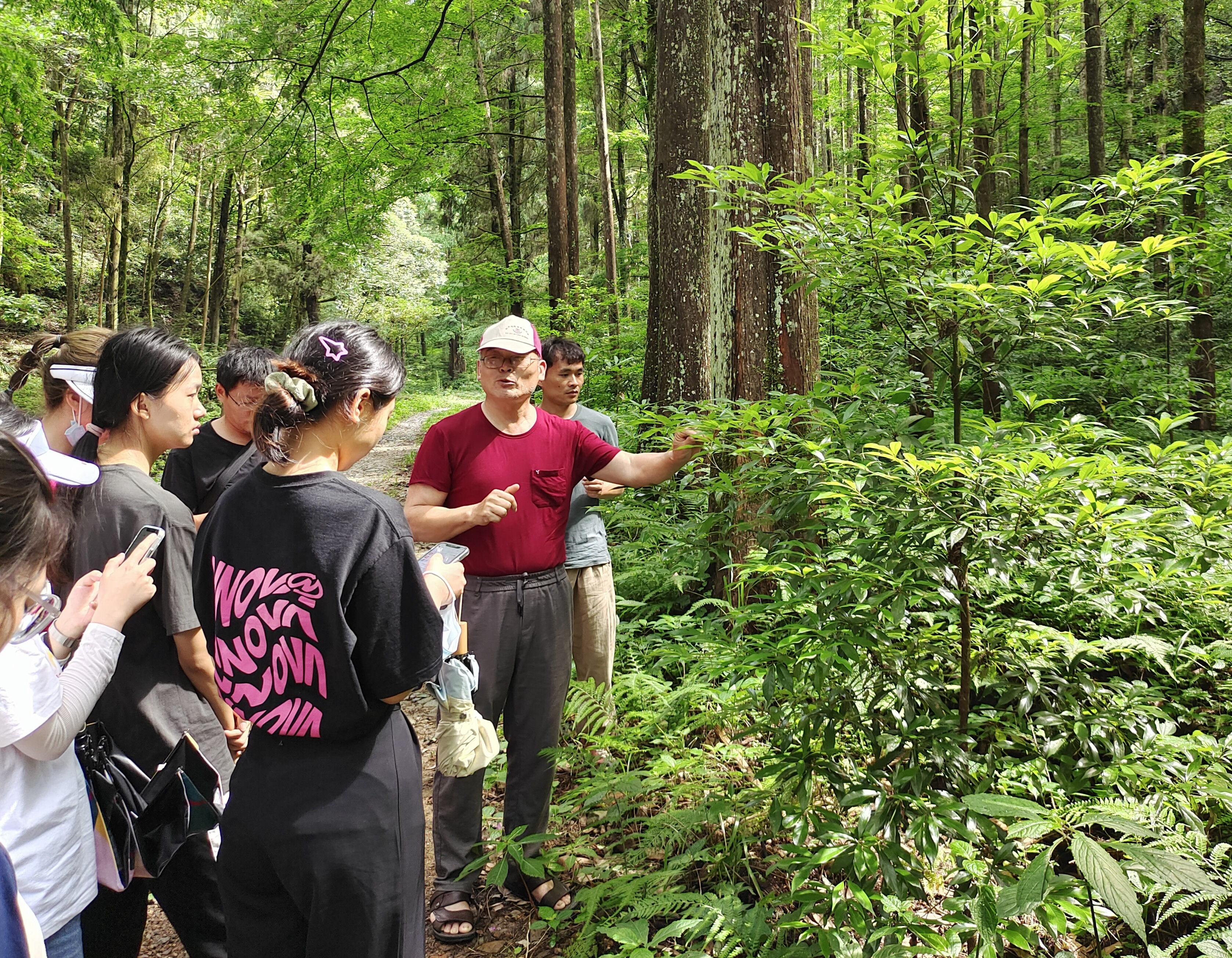6月23日野外考察了寿昌林场绿荷塘林区古楠木国家森林公园。据悉,该楠木林为亚洲最大的天然楠木林。同学们在已退休林场职工潘老师的讲解下深入了解这片楠木林的保护历史,观赏森林中的“水杉王”,辨认不同属的楠木,收获颇丰(图3)。随后,大家来到位于建德市莲花镇的九仙铁皮石斛种植基地,该地以“农旅结合”的发展模式而闻名,形成“以农促旅、以旅兴农”的发展之路(图4)。基地的讲解员为大家介绍了多种具有不同药用价值和观赏价值的石斛品种,同学们纷纷惊叹于石斛极高的生态价值与经济效益。