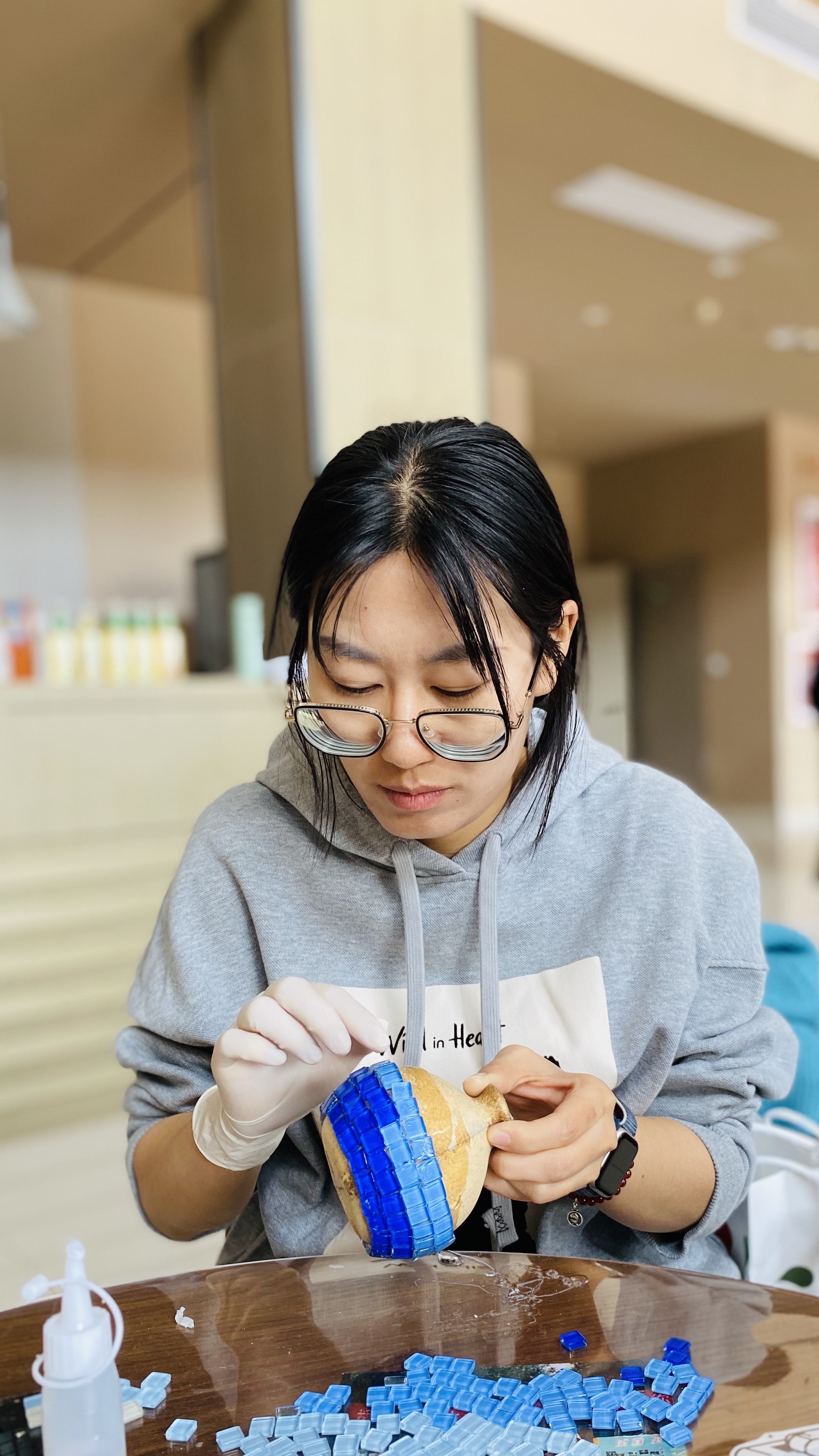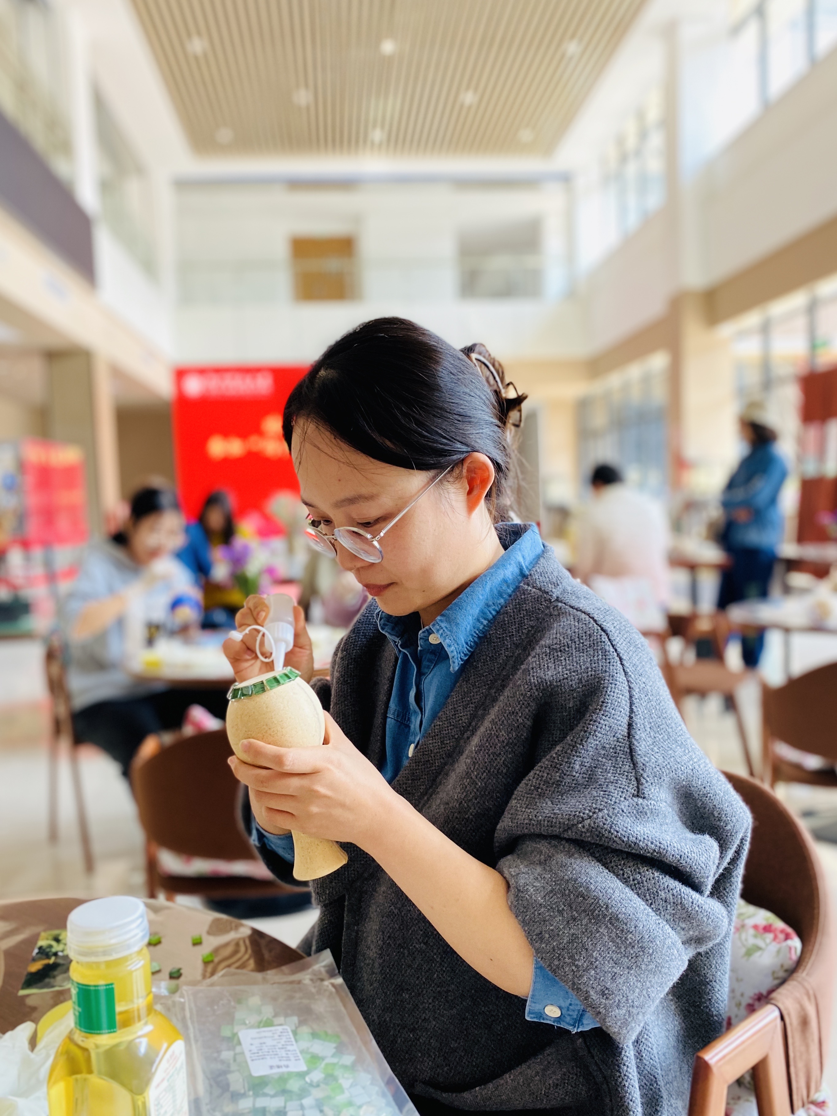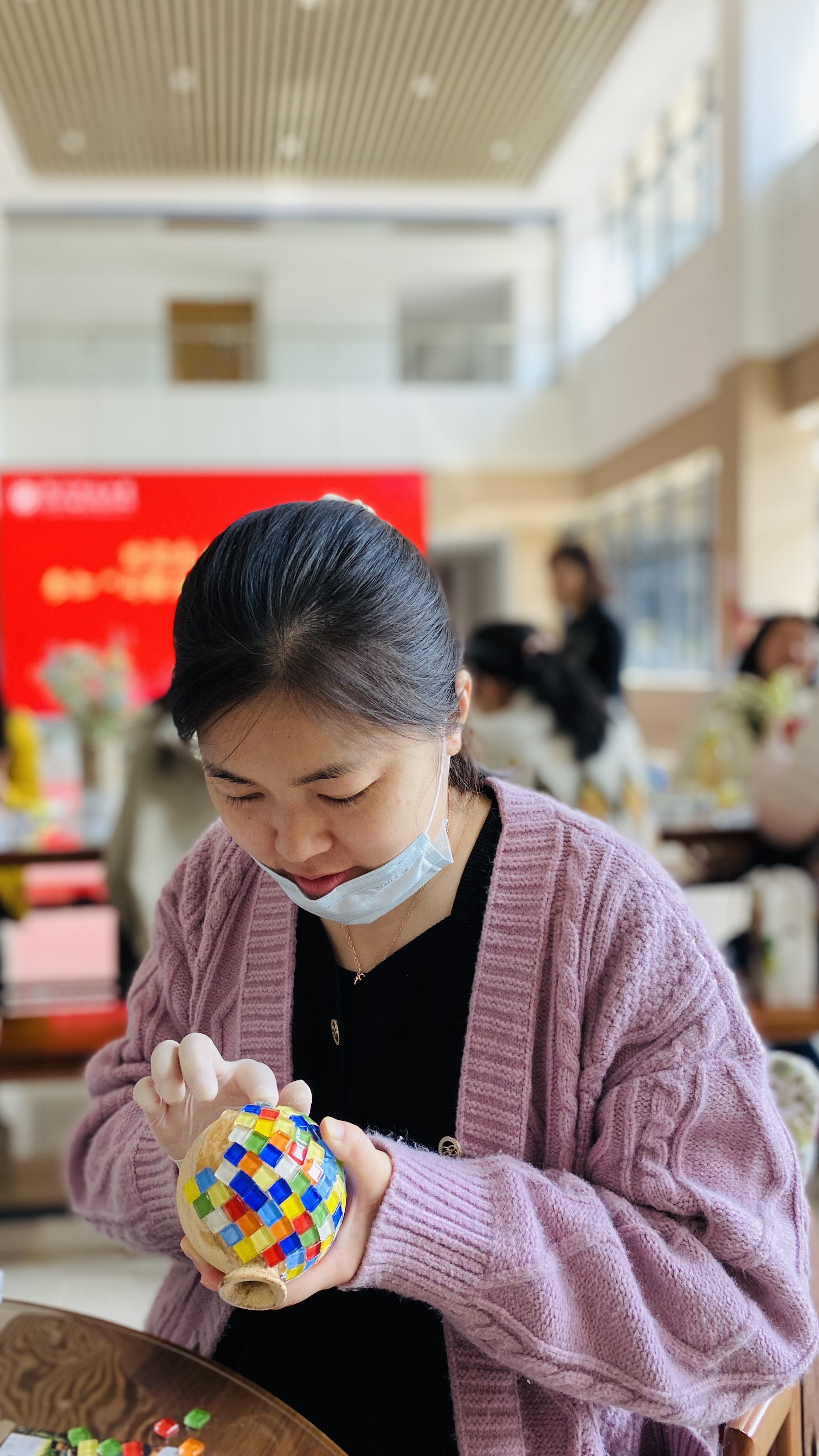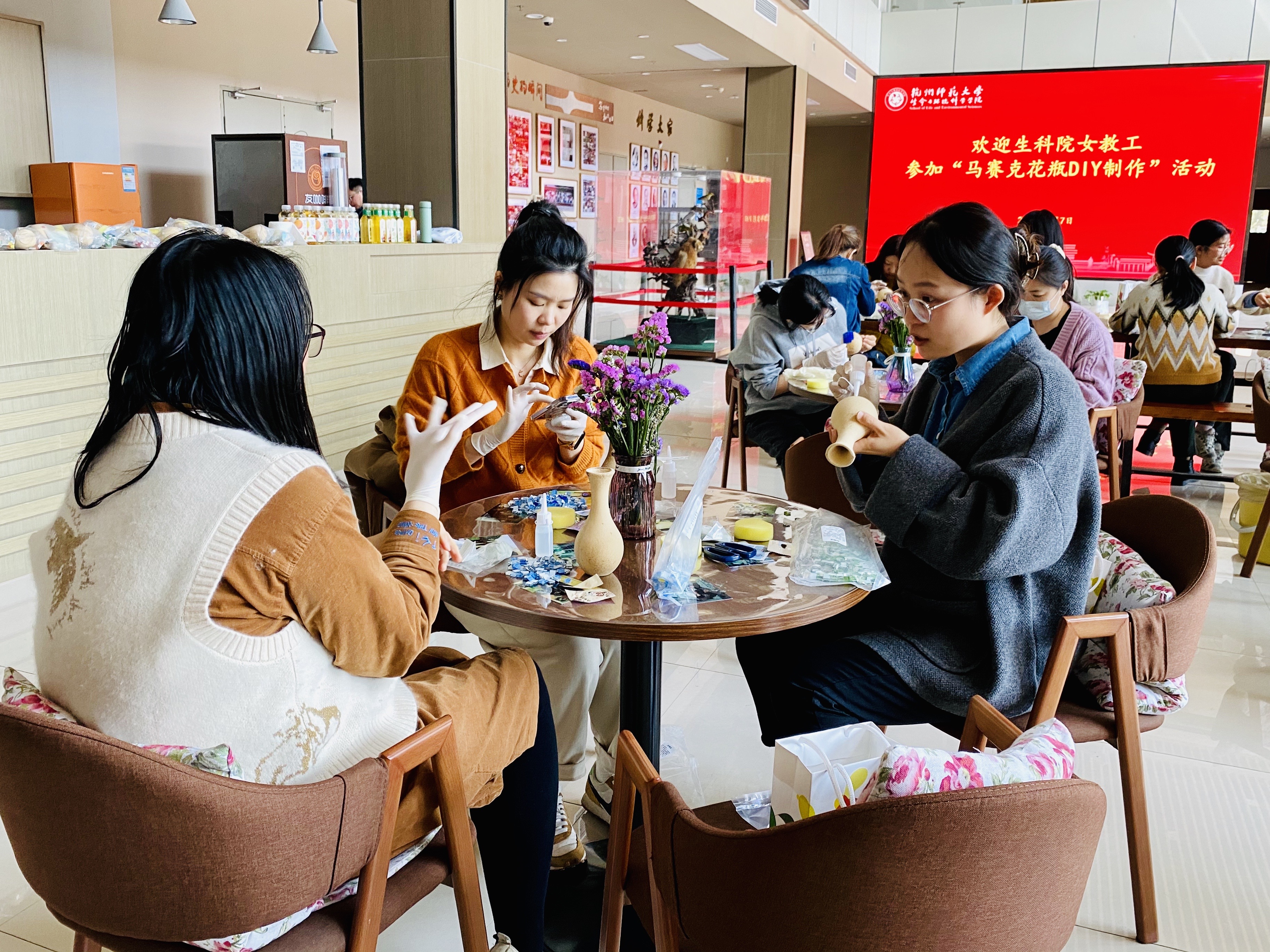 活动期间,女教师们齐聚在慎园15号楼一楼大厅,领取制作马赛克花瓶的原料,如马赛克片等。互相交流后,心灵手巧的女教师们很快掌握了技巧并动手镶嵌起来,搭配干花花束,巧妙地使DIY花瓶成为最炫的艺术品。