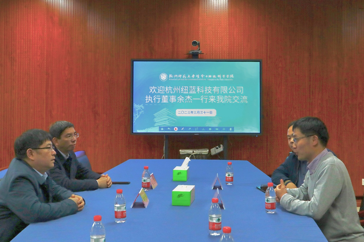 2023年3月31日,杭州纽蓝科技有限公司执行董事余杰一行到学院交流,做爱自拍 党委书记张立明、院长薛大伟等参加,双方就学生就业、本科生定向培养、研究生培养、平台合作等进行了合作探讨。