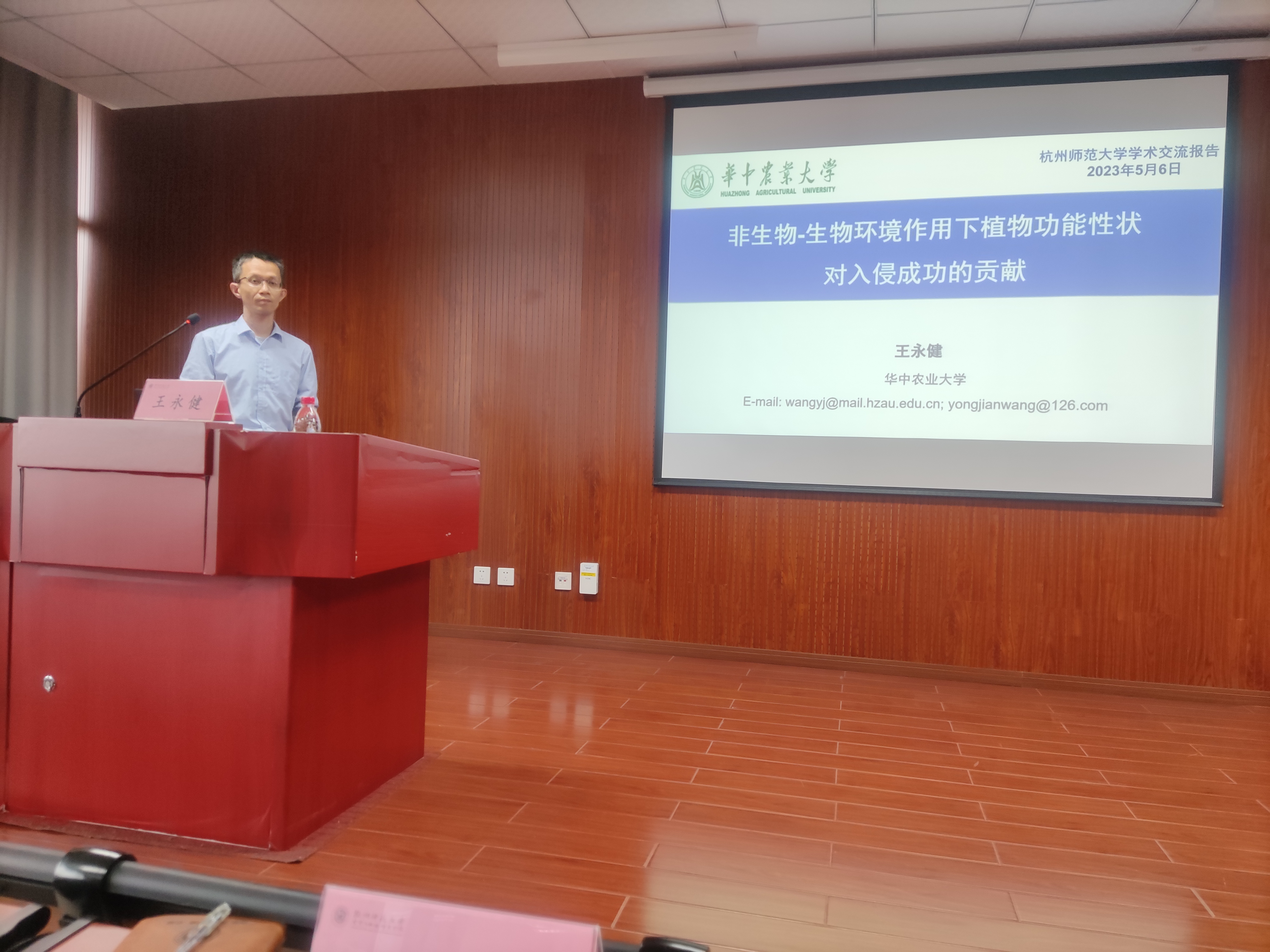5月6日下午,做爱自拍 在慎园15-309报告厅举行了2023年第15期生科撷英讲坛,国家级青年人才计划入选者、狮山硕彦计划拔尖人才A类、生物入侵与防治团队负责人王永健教授,应邀来做爱自拍 为师生们做了题为“非生物-生物环境作用下植物功能性状对入侵成功的贡献”的学术交流报告,生态学学科的教师、研究生和本科生踊跃参加。