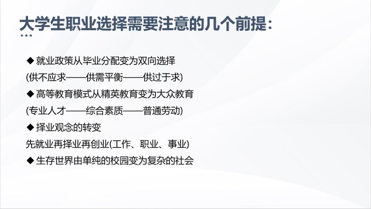 会议分为两项议程,第一项议程观看视频,观看已经就业学长学姐分享的经验视频,学长学姐以自己的就业故事为例,希望同学们要抓住机遇、把目光放长远,同时也告诫同学们对未来的规划不可好高骛远、脱离实际,要将自身实际情况与目标相结合。同时还着讲述了参军入伍也是一个就业方向,在提高自身身体素质的同时还能实现自我价值。会议第二项议程,就业辅导员杨加堂老师作对就业具体工作进行安排部署。杨老师在国家政策、经济、就业途径等多方面进行详细的讲述和分析,并向同学们介绍了高校各类毕业生去向和应届毕业生身份的界定,希望同学们时刻明确自己的定位,朝着目标不断进取。