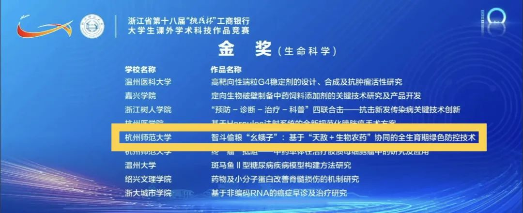 5月19日至21日,浙江省第十八届“挑战杯”大学生课外学术科技作品竞赛决赛在我校举行。经过集中答辩环节角逐,做爱自拍 报送的《智斗偷粮“幺蛾子”:基于“天敌+生物农药”协同的全生育期绿色防控技术》荣获金奖。