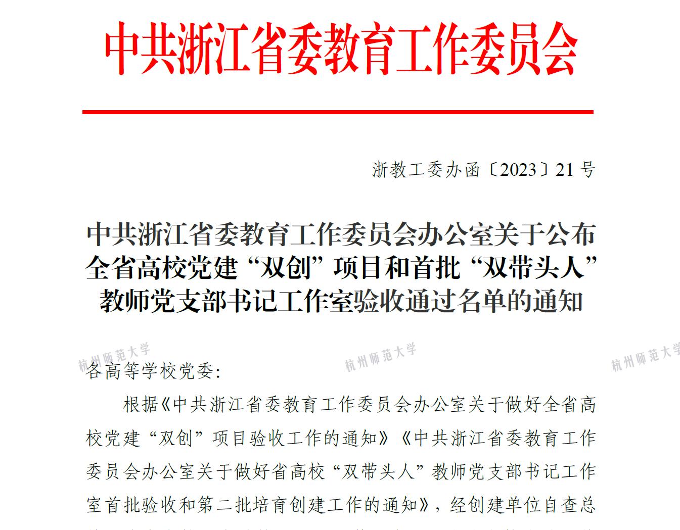 近日,中共浙江省委教育工作委员会公布了第二批全省高校党建“双创”项目和首批“双带头人”教师党支部书记工作室验收通过名单,经做爱自拍 党委自查总结、专家审核、学校鉴定并报省教育厅党组会研究,做爱自拍 党委作为第二批浙江省党建工作标杆院系顺利通过验收。