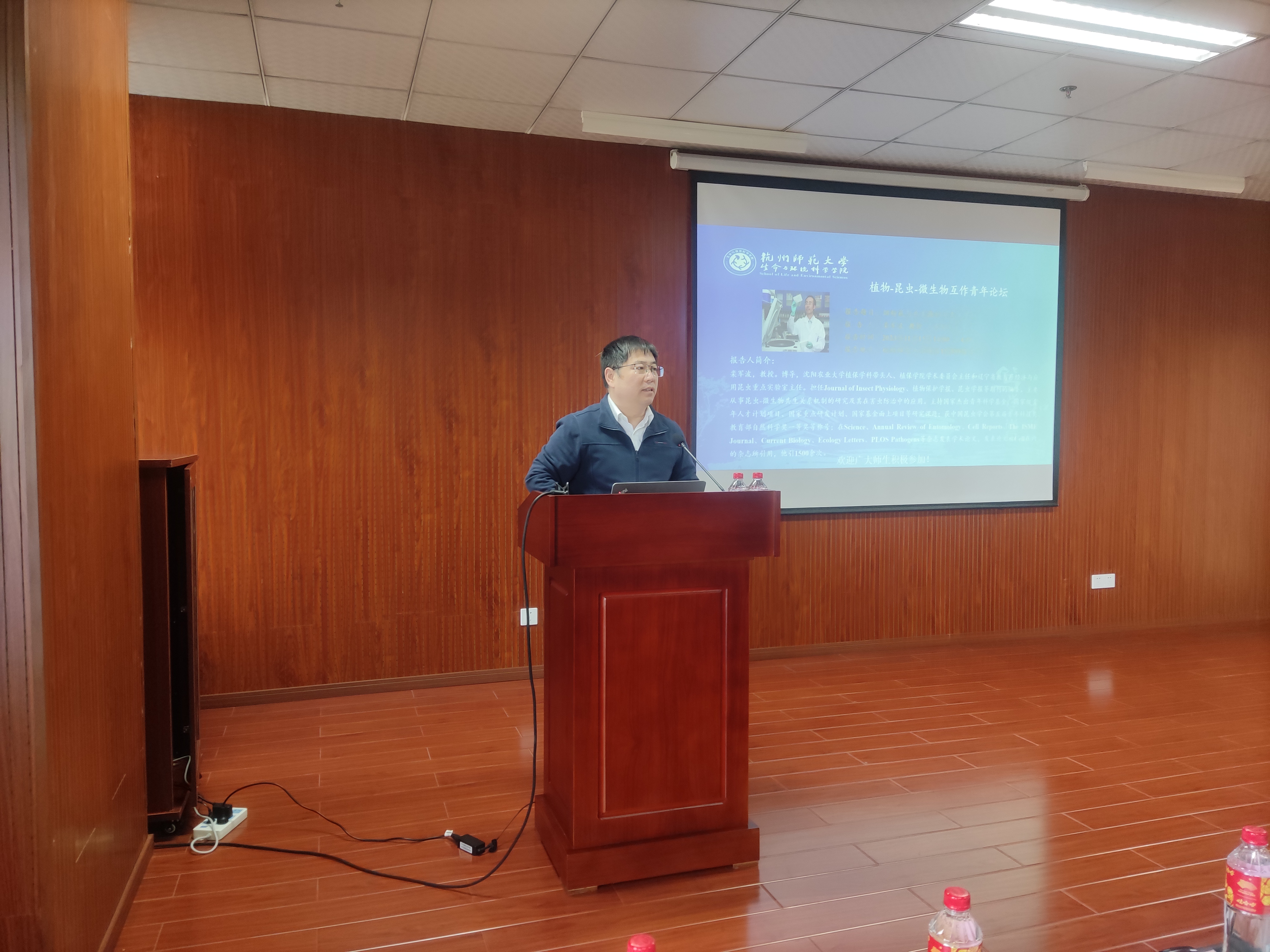 浙江大学“百人计划”研究员周文武教授,作了《马铃薯-昆虫-环境多维互作的分子机制》学术报告,讲述了生物互作研究从“种间互作”向“生态互作”的最新研究进展,介绍了其团队在“马铃薯-马铃薯块茎蛾”互作性状受高温、干旱的塑造以及微生态可塑性调控方面的最新研究成果。