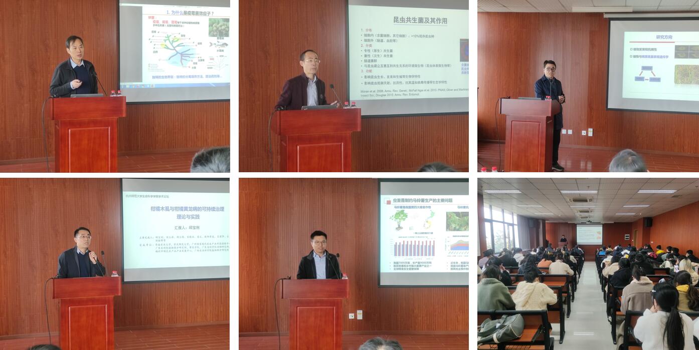国家高层次人才特殊支持计划、科技部中青年科技创新领军人才重庆师范大学的邱宝利教授与师生们一起分享了其近10年在柑橘黄龙病防控中的科研成果,作了《柑橘木虱及柑橘黄龙病的可持续治理理论与实践》学术报告。邱宝利教授从柑橘黄龙病的起源讲起,详细介绍了柑橘木虱在传播柑橘黄龙病中关键作用及其分子机制;其团队在明确柑橘黄龙病发生规律的基础上,研发了高效的生防产品,形成了一系列有效的针对疫区和非疫区柑橘黄龙病的绿色防控技术体系。该成果在刚刚结束的2022年度广东省科技进步奖评选中荣获一等奖。