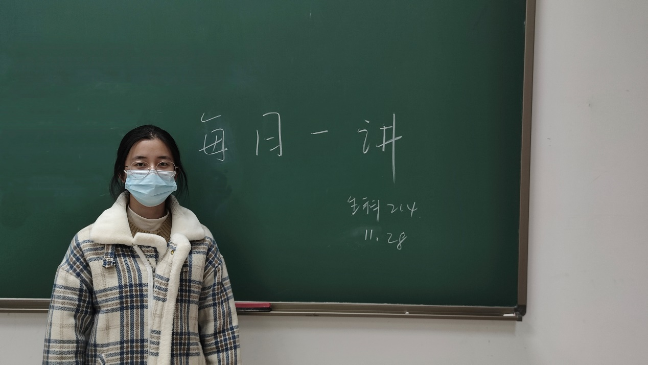 2023年11月29日,谢烨欣在慎园2号楼205进行“越拼才越‘顺’,初心‘泳’不变”的每日一讲演讲。