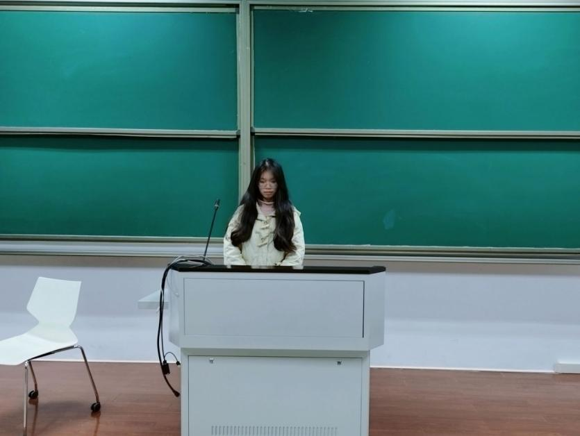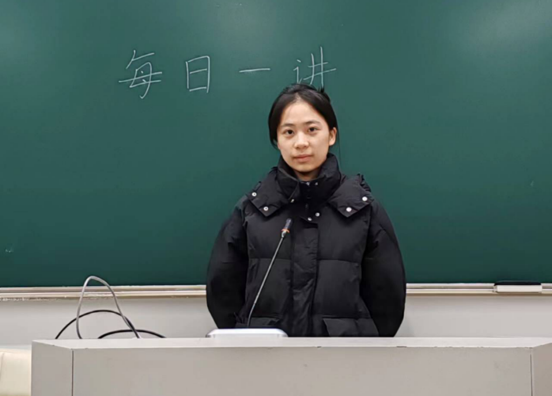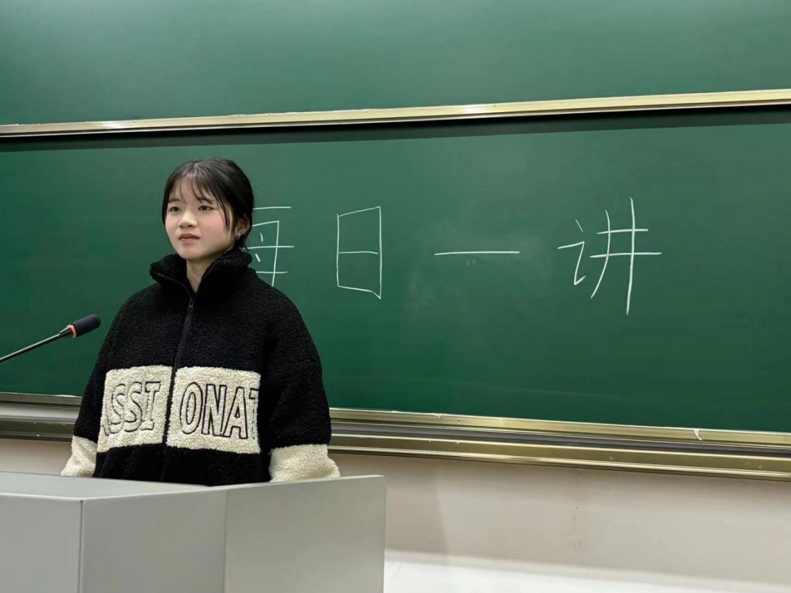 2023年12月28日,在做爱自拍 仓前校区慎园2号楼教室中,吕兰心同学在课前向同学们做以“延续红色基因,厚植爱国情怀”为主题的每日一讲活动。
