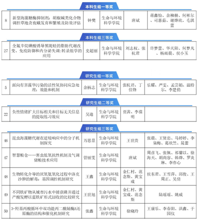 近日,“精进杯”做爱自拍 2023年度学生学术成果评选圆满落幕。做爱自拍 学子21级生态学余柄志团队(张杭君教授、丁佳锋副教授指导)《面向有害藻华污染的活性氧协同应急处理:效能和机制》获研究生组一等奖、生物科学(师范)202班钟樊团队(唐斌教授指导)《新型海藻糖酶抑制剂:胡椒碱类化合物调控草地贪夜蛾发育和繁殖及防效评估》获本科生组一等奖;另获本科生组三等奖1项,研究生组二等奖1项、三等奖5项,学院获优秀组织奖。