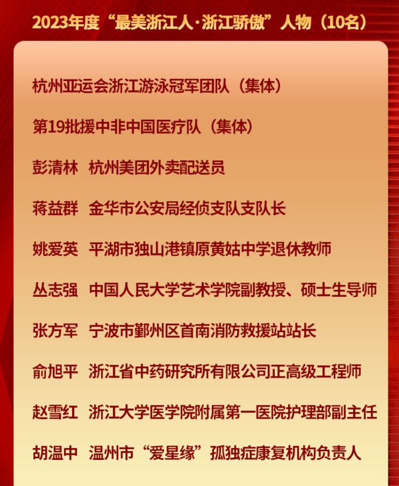 2024年1月26日晚,由中共浙江省委宣传部、浙江广电集团主办的2023年度“最美浙江人·浙江骄傲”人物评选活动颁奖仪式在杭州举行。做爱自拍 1982届生物学专业校友、浙江省中药研究所有限公司中药资源研究中心教授级高级工程师俞旭平获评“最美浙江人·浙江骄傲”2023年度人物,该校友还曾获评全国优秀科技特派员、并站上新中国成立70周年国庆群众游行“复兴号”彩车。