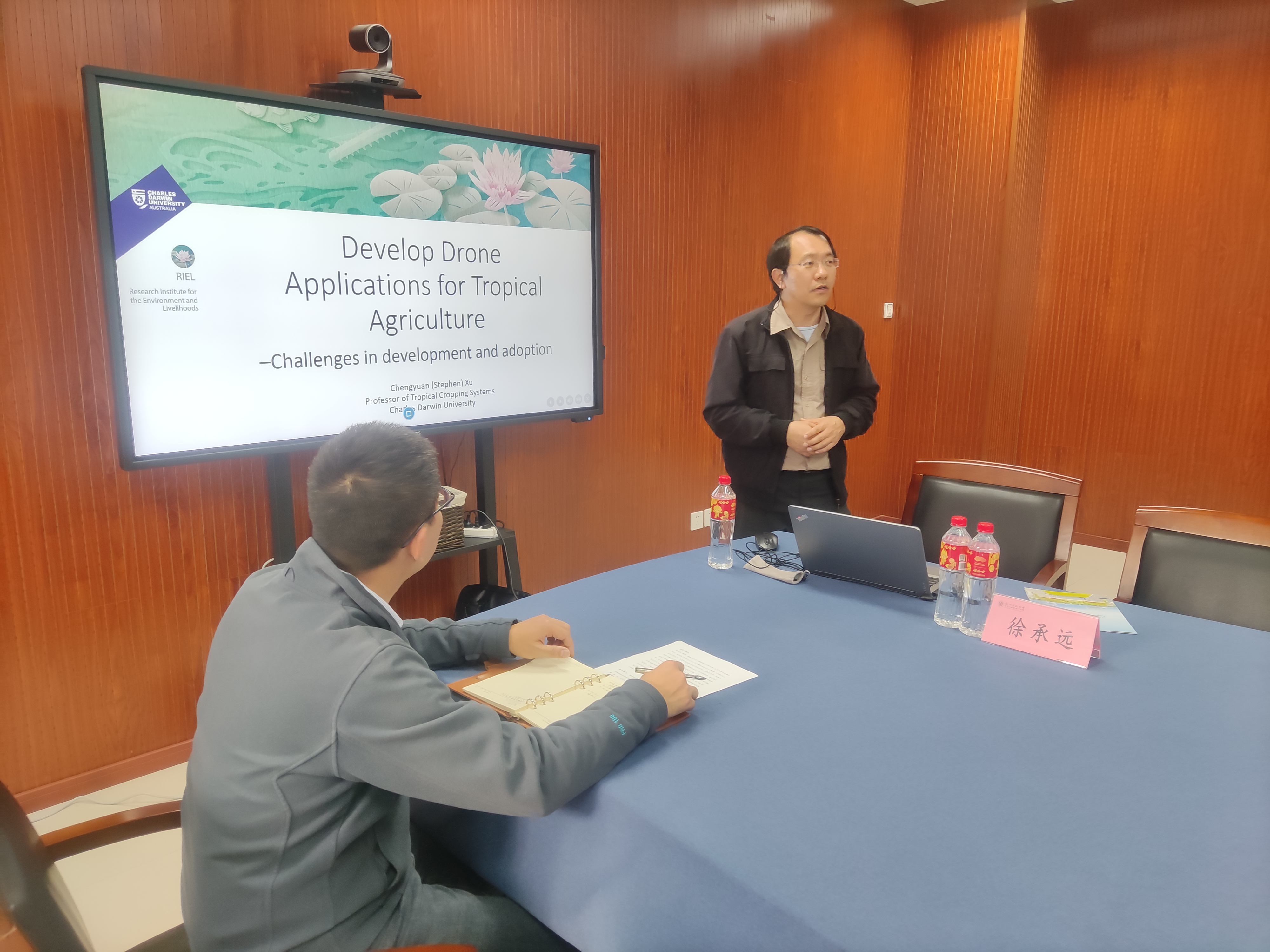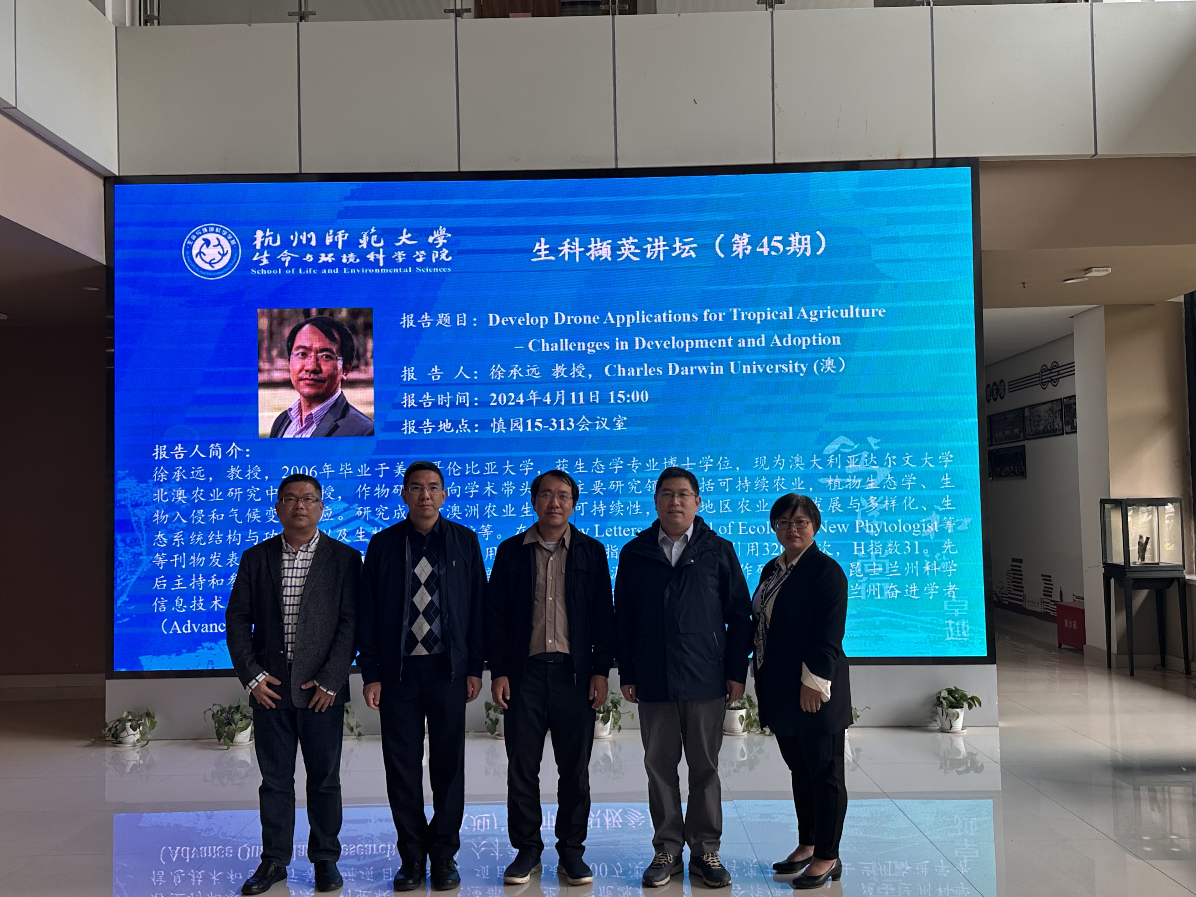 2024年4月11日下午,做爱自拍 在慎园15-313会议室举行了2024年第45期生科撷英讲坛,澳大利亚查尔斯·达尔文大学徐承远教授应邀来做爱自拍 为师生们作了题为“Develop Drone Applications for Tropical Agriculture – Challenges in Development and Adoption”的学术报告,报告前,薛大伟院长、张立明书记、宋垚彬副院长、陈慧丽教授与徐教授进行了座谈会。宋垚彬副院长主持报告会,生态学相关教师和研究生积极参加。