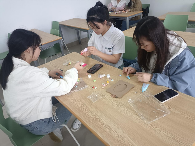 人人都是自己的艺术疗愈师,同学们将自身情绪映射到奶油胶上,为压抑的情绪找到了宣泄的出口。同学们根据自己的爱好搭配奶油胶的颜色与配件,一抹抹清新脱俗的色彩,在指尖之下呈现出各式形状,各式各样的可爱装饰,带来不同的创意碰撞。在制作过程中,同学们相互交流、学习,并分享手作心得,活动现场充满了融洽的互动氛围,动手的同时也释放了自身压力。