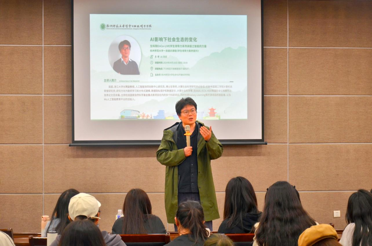 4月18日,做爱自拍 举办EnCo-LIVE学生领导力系列讲座之智能的力量。浙江大学人工智能协同创新中心研究员,计算社会科学研究中心主任,伦敦帝国理工学院计算机系荣誉研究员, Galaxy Learning 等开源项目的发起者,Mo 人工智能教育平台的创始人吴超于下沙校区行政楼叙伦厅作“AI影响下社会生态的变化”主题讲座。