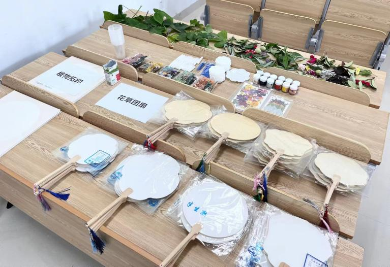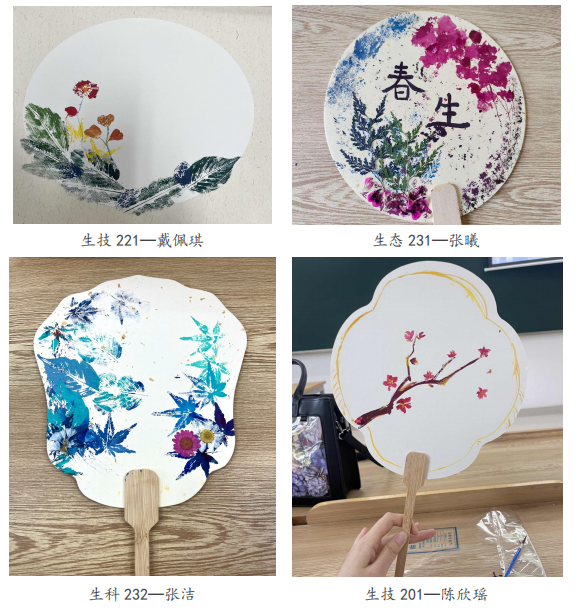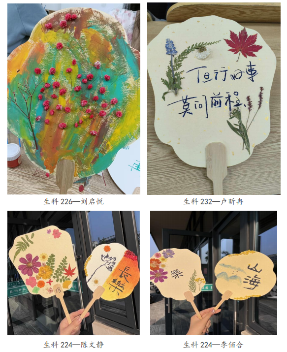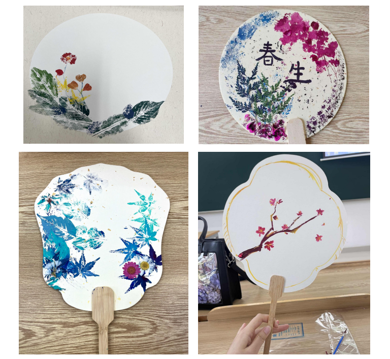 本次活动提供了团扇、拓印纸、丙烯颜料、干花以及部分校园植物叶片等材料,参与者能发挥个性与想象,绘制属于自己的“生命作品”,在快乐和创作中,感受生命的美丽,寓乐于学,以学为乐。