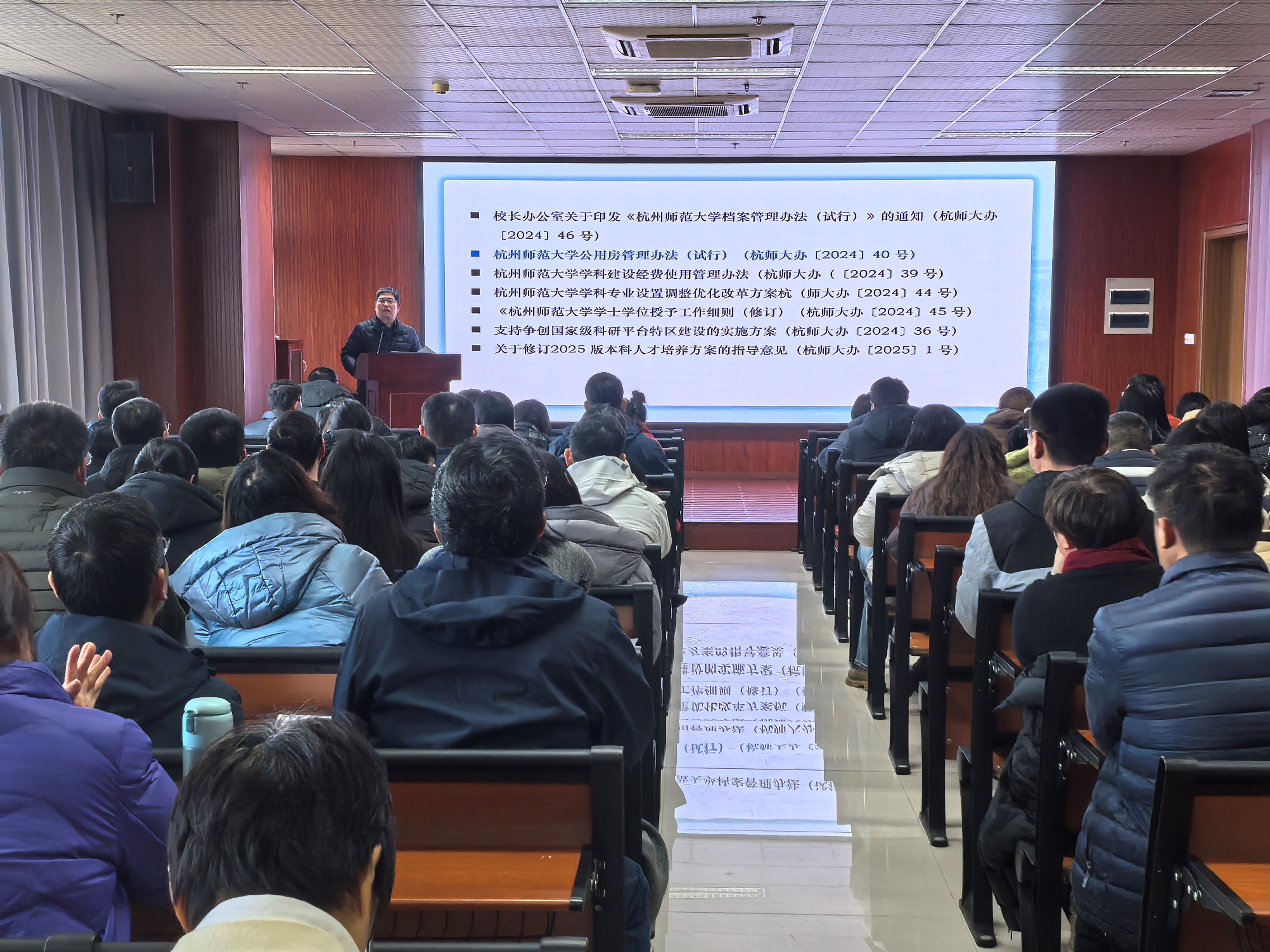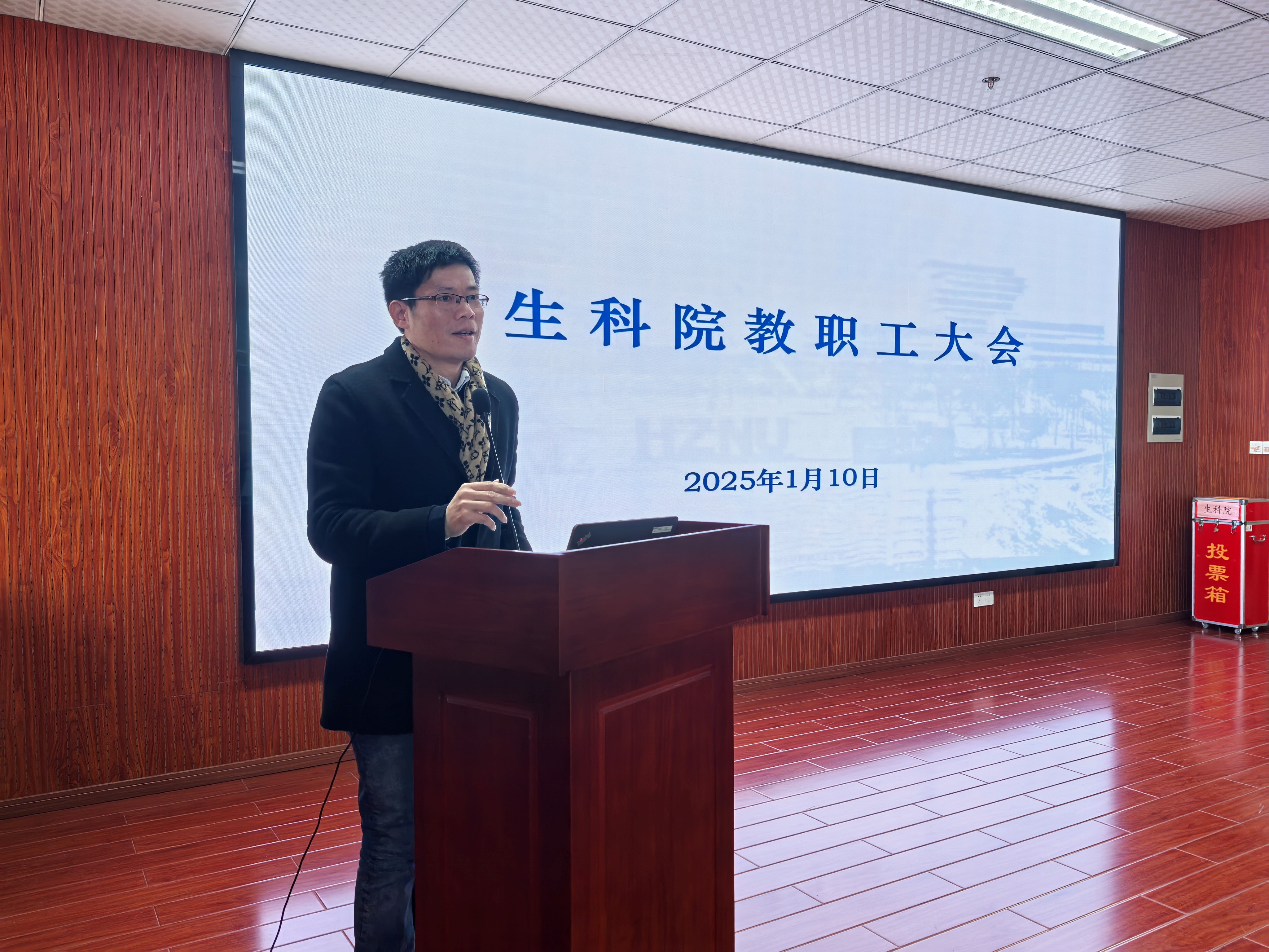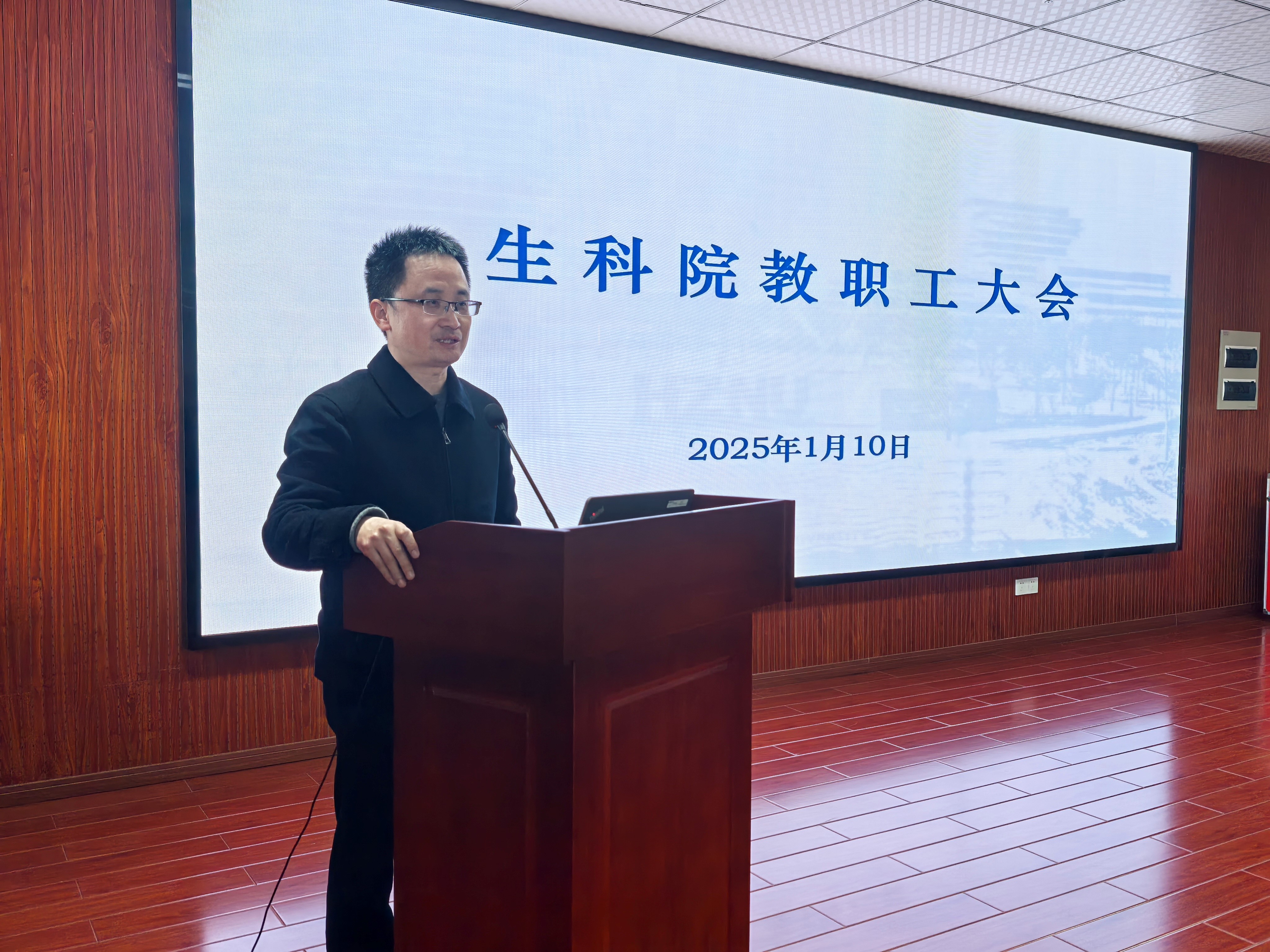 随后,江齐里从意识形态、党风廉政、师德师风和综合治理等方面进行了工作部署。薛大伟从学院国家级人才引荐、2025年国家自然科学基金申报、学生就业、期末考试工作、实验室安全、学术道德和绩效工资征求意见等方面进行工作部署,并与会教职工一起重点学习了学校重要文件。