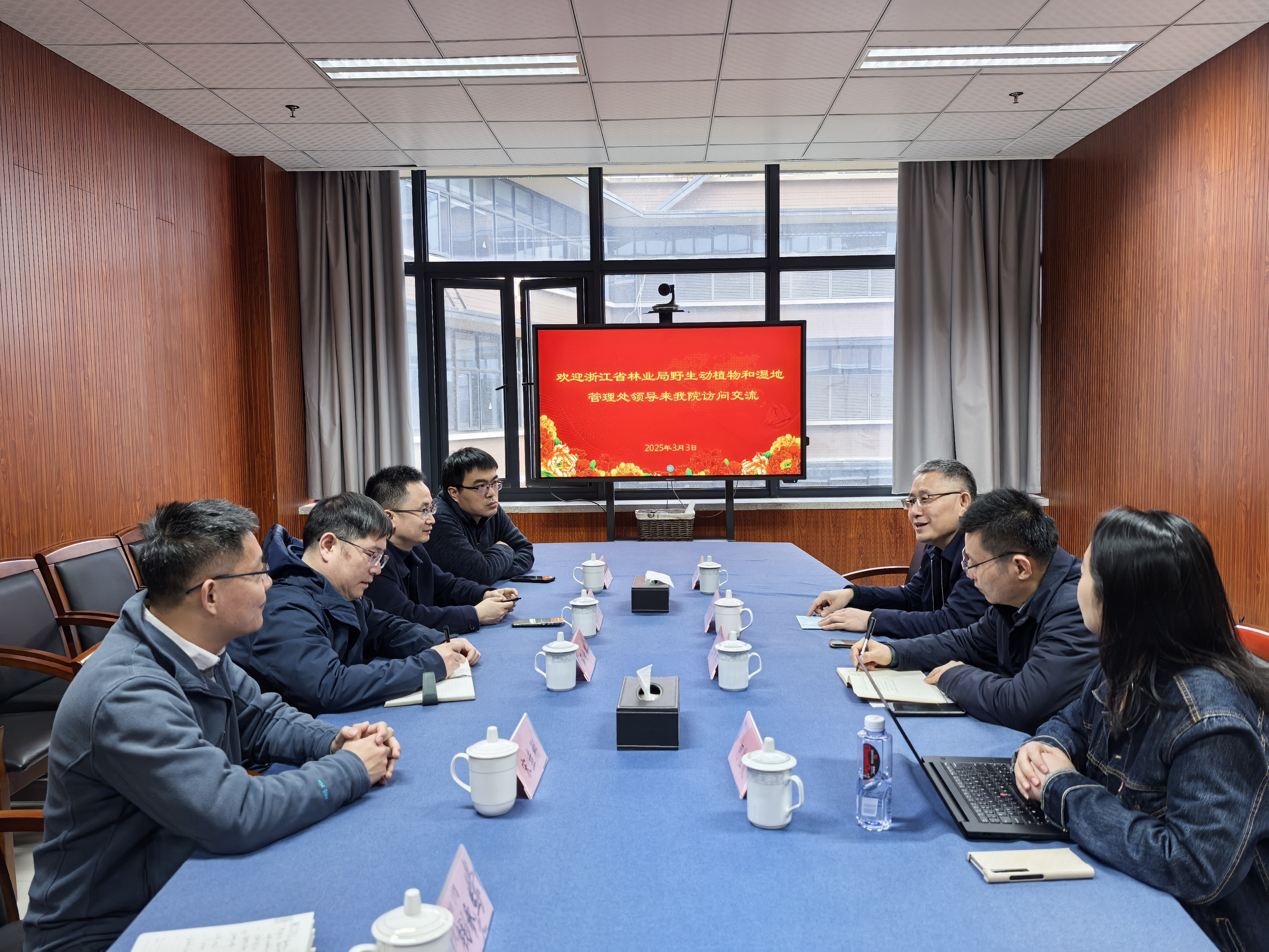 近日,浙江省林业局野生动植物和湿地管理处处长洪流、副处长张松才等一行来做爱自拍 访问交流,就湿地人才挂职、野生动植物保护、湿地生态修复及产学研合作等议题进行深入交流。院长薛大伟、党委书记江齐里、人事处副处长胡潭高、副院长宋垚彬及动物标本馆馆长金斌松等陪同接待并参与座谈。