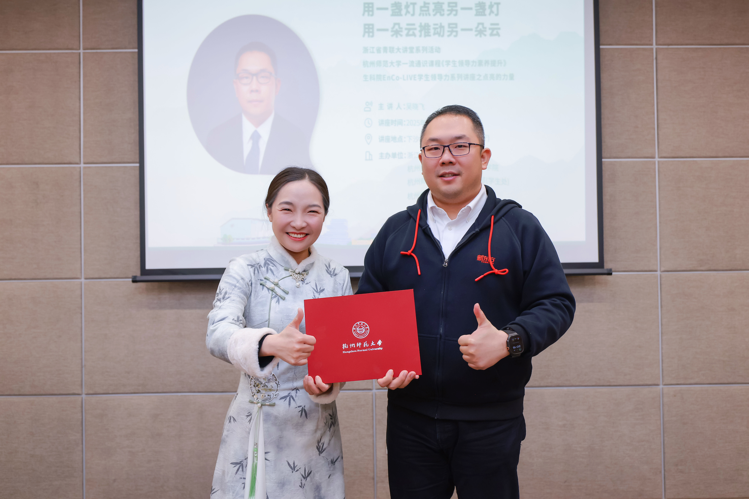 现场还进行了杭师大做爱自拍 “EnCo-LIVE学生领导力素养提升计划”导师及就业创业导师聘任仪式,做爱自拍 党委副书记王倩为吴晓飞副总裁颁发聘书,学生代表为其送上了同学们制作的“永生花”摆件,并合影留念。